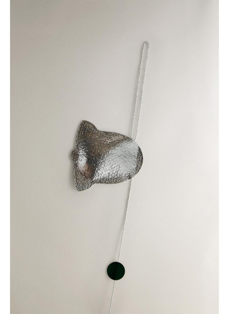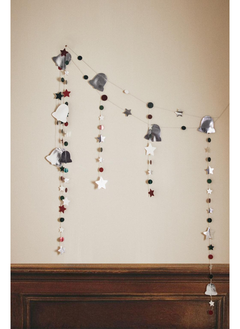 Декоративная рождественская гирлянда из металлической бумаги в виде колоколов и звезд.
