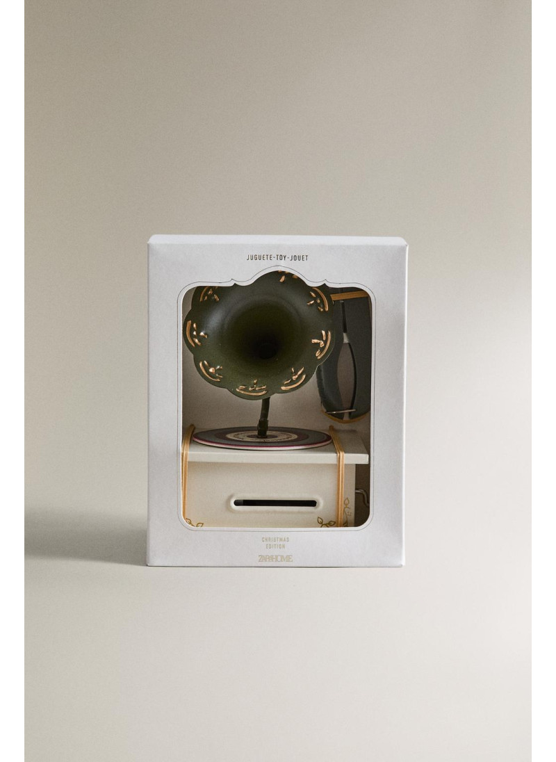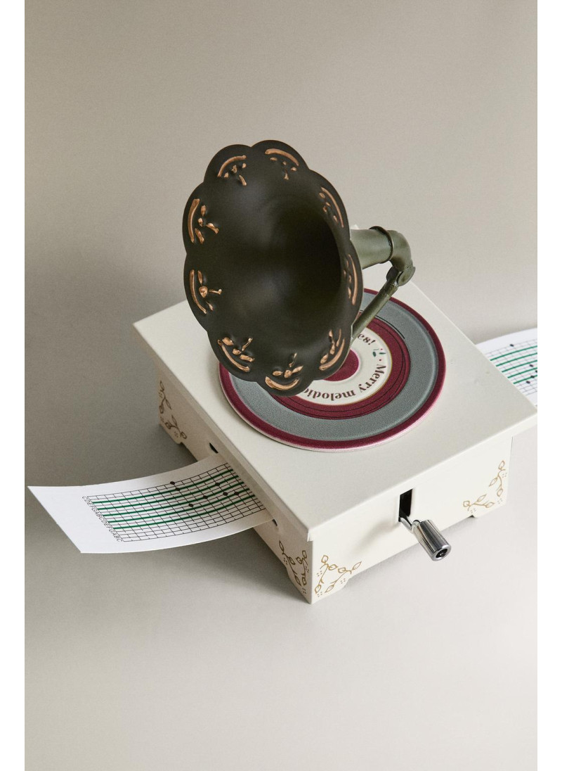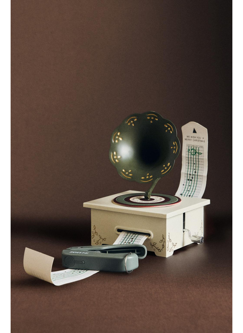 Детская игрушка в виде музыкального граммофона в рождественском стиле. В комплекте 8 листов музыки (2 с рождественскими песнями и 6 пустых для пробивки) и инструмент для пробивки. Вставьте листы в граммофон, закрутите его и наслаждайтесь музыкой...