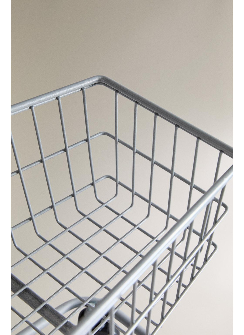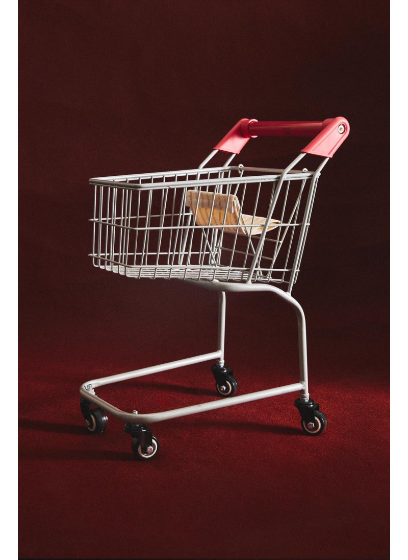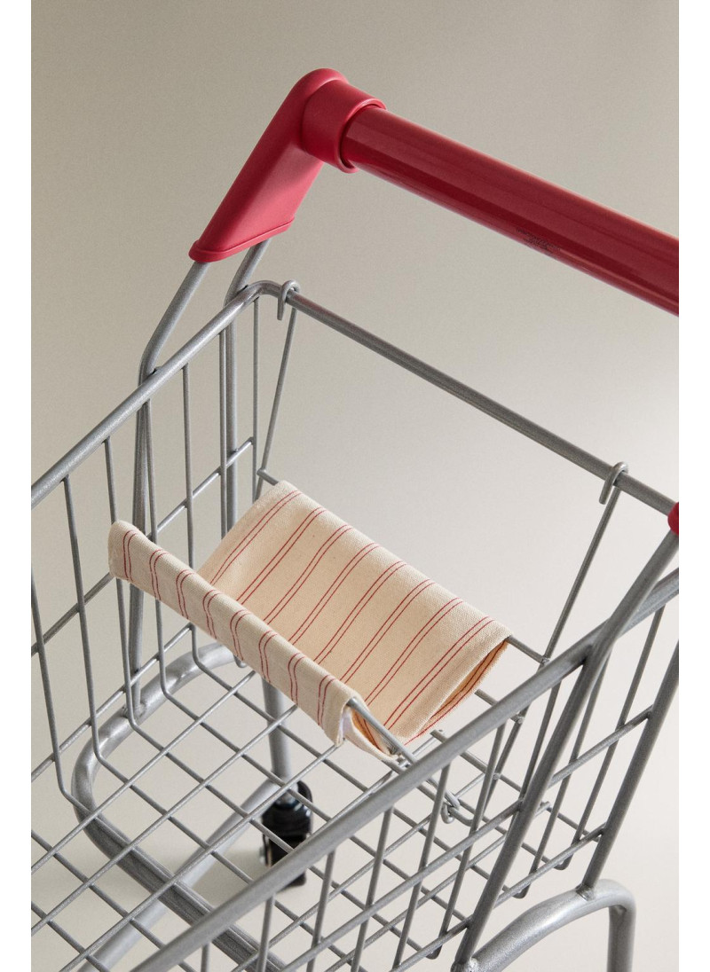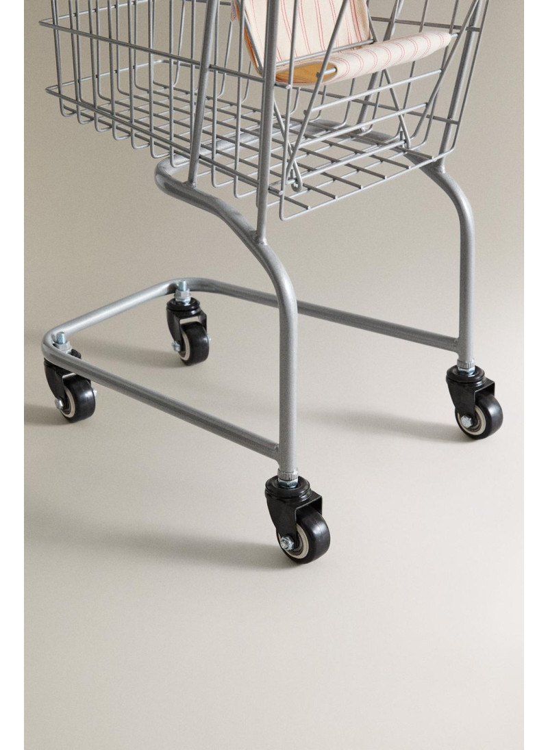 Детская металлическая игрушечная супермаркетная тележка с цветной ручкой, функциональными колесами и передним сиденьем для размещения игрушек.