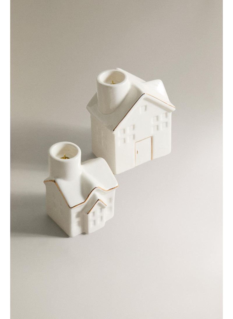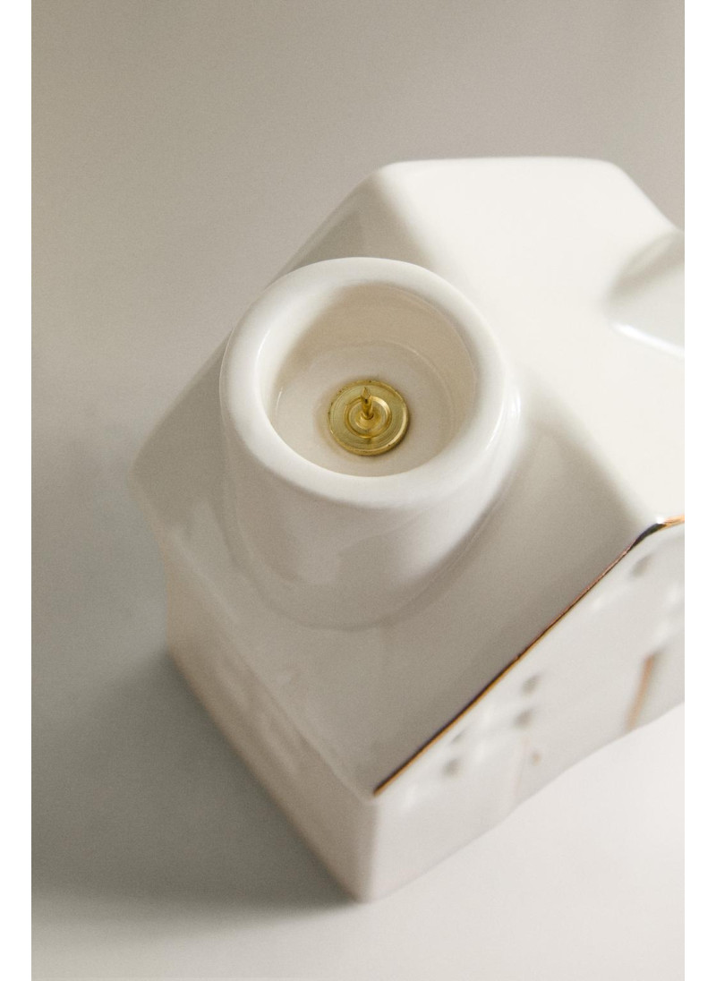 Рождественский свечной подсвечник из фарфора в форме дома с блестящими краями. Дымоход служит держателем для свечей диаметром 2,2 см.