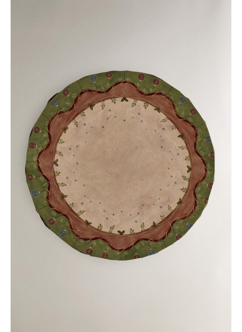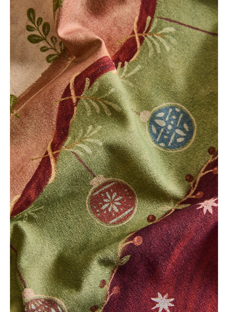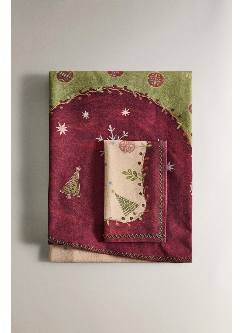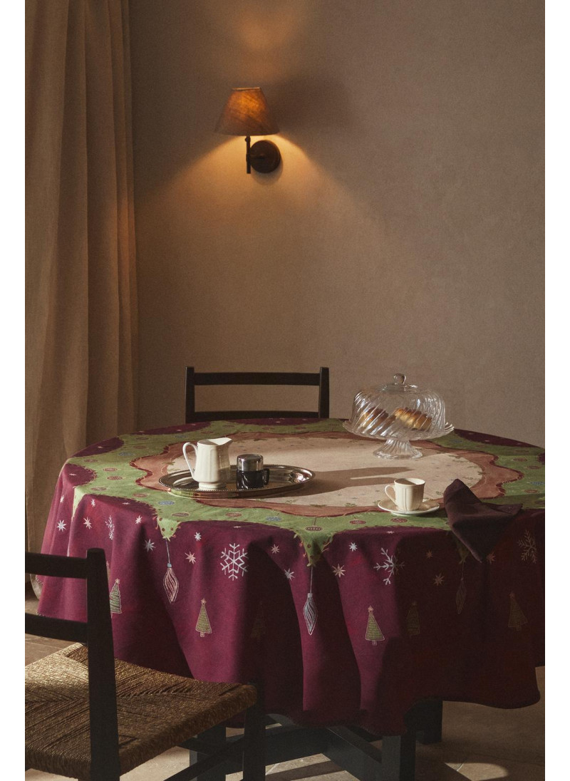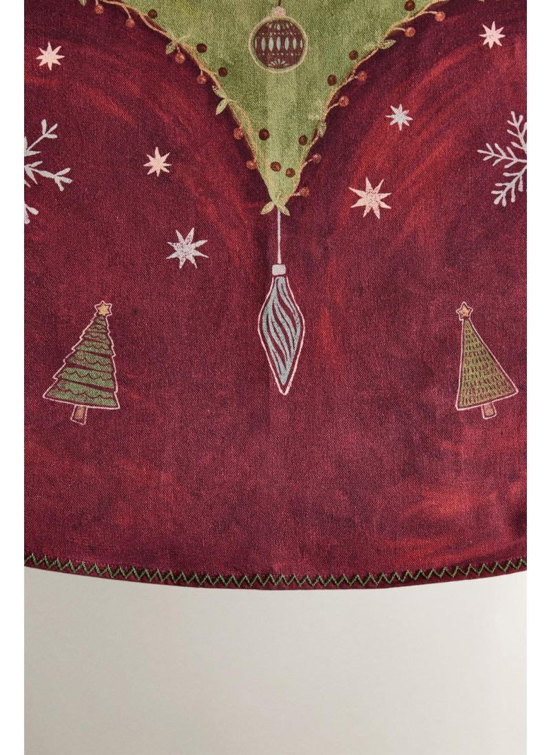Хлопковая скатерть с новогодним дизайном: снежинки, ели, звезды и шарики.