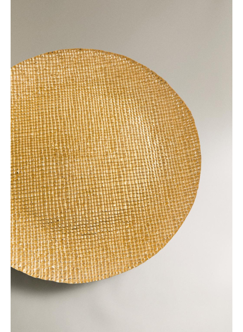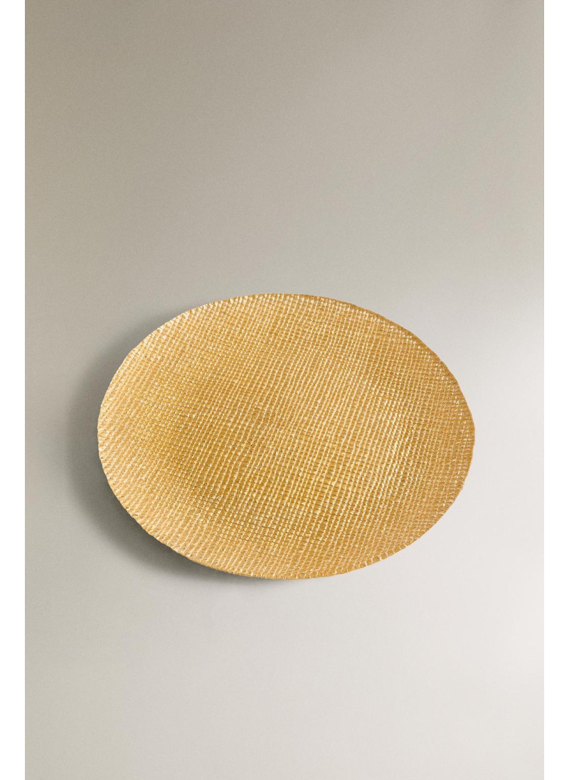 Стеклянное сервировочное блюдо с неровной текстурой и блестящим золотым покрытием.