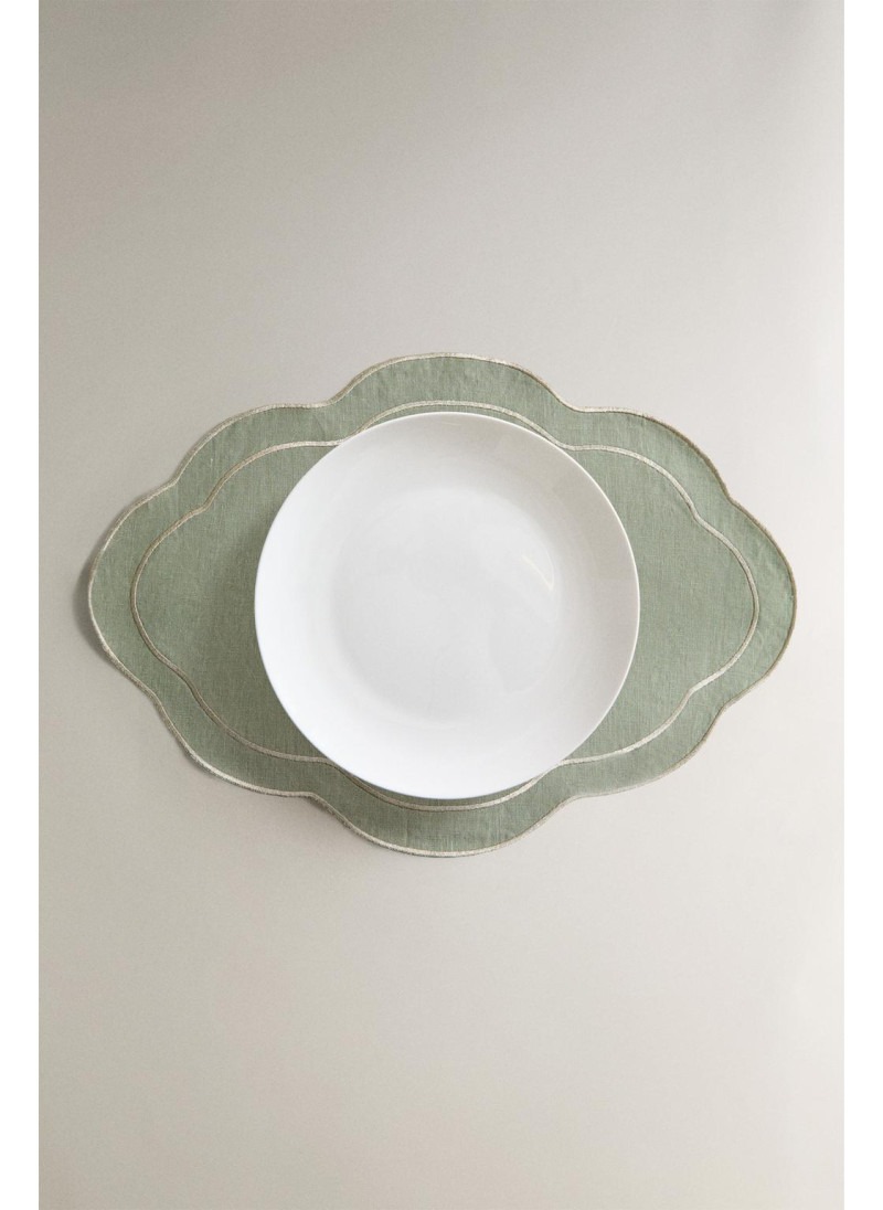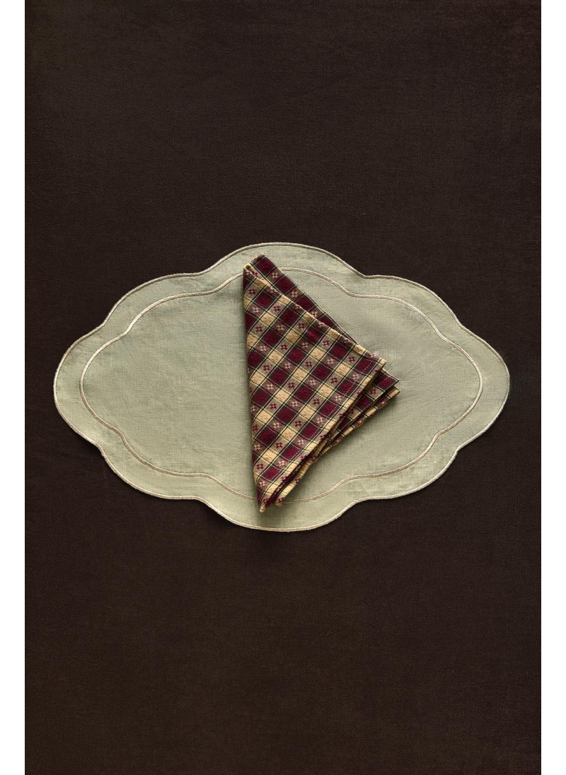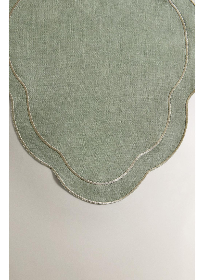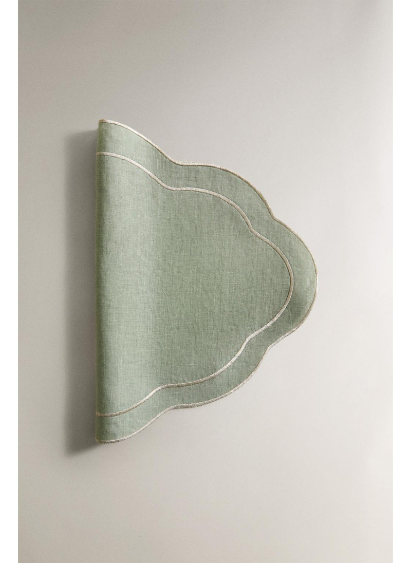 Льняное рождественское салфетка с изогнутыми краями и вышитой белой отделкой из ниток.