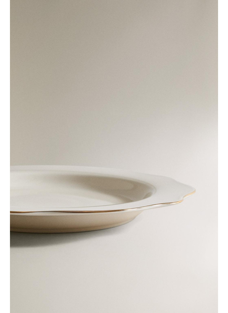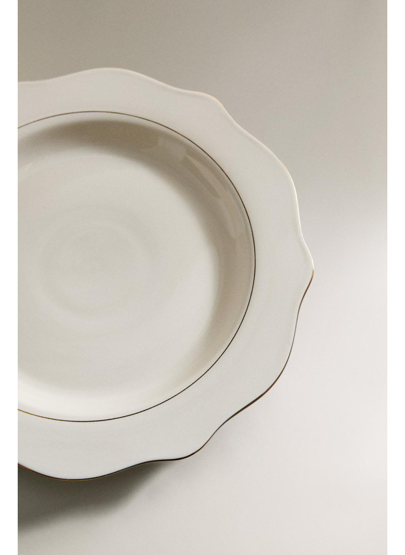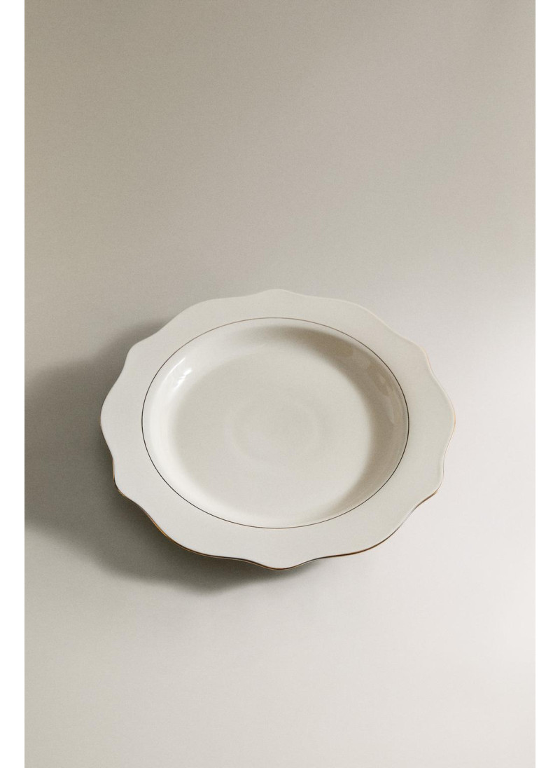 Фарфоровая обеденная тарелка с волнообразным краем и золотыми деталями на краю...