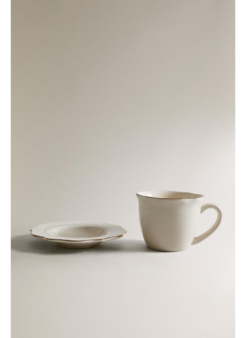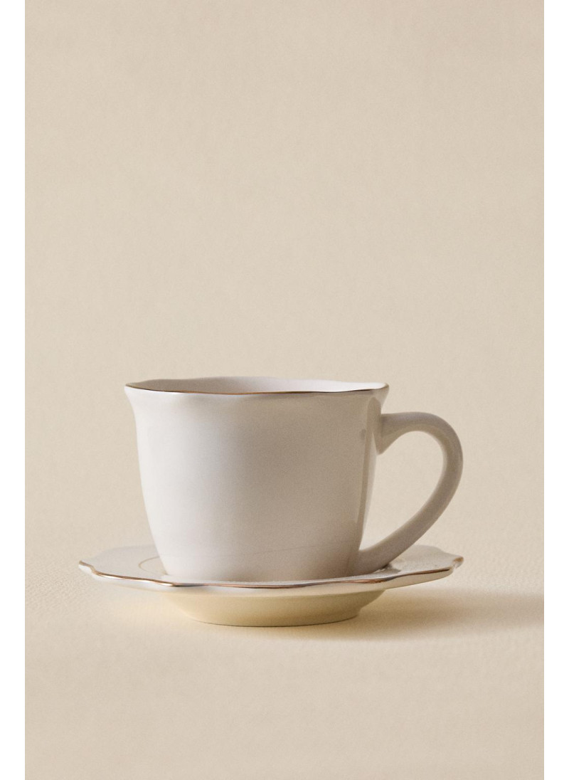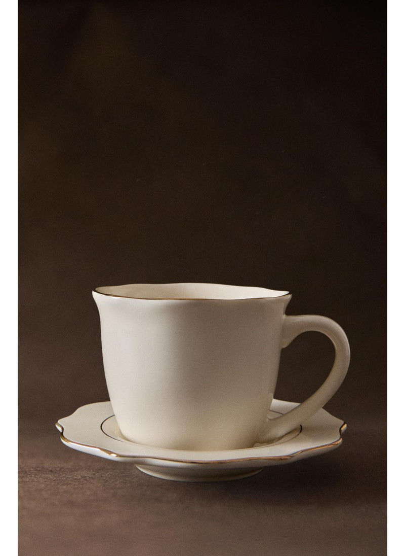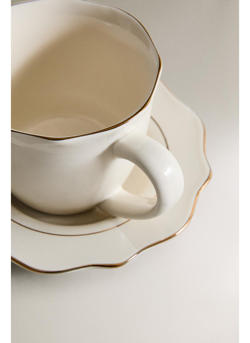Фарфоровая чашка и блюдце с волновым краем и золотыми деталями на ободе...