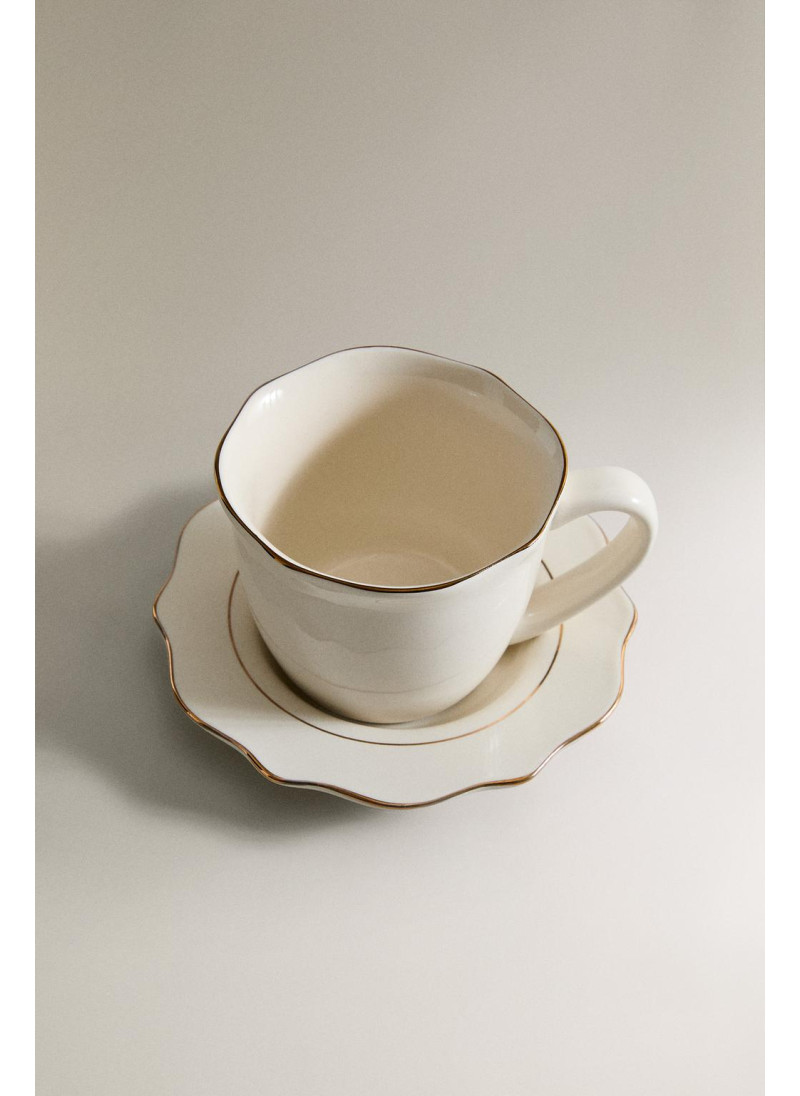 Фарфоровая чашка и блюдце с волновым краем и золотыми деталями на ободе.