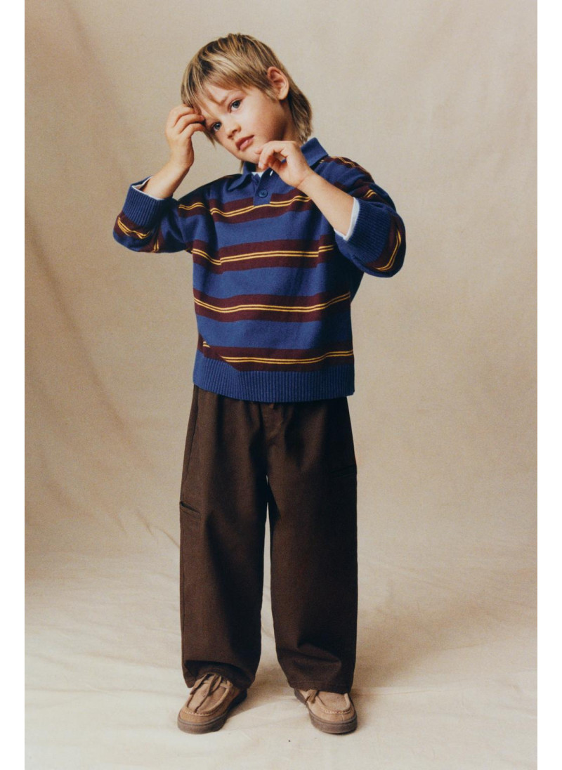 Длинрм рукавом поло из вязаного полотна с воротником-поло. Имеет пуговицы по горловине типа Henley и полосатый принт.