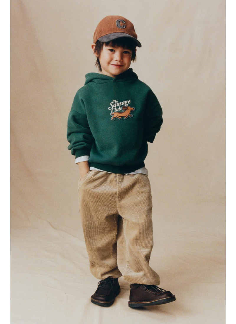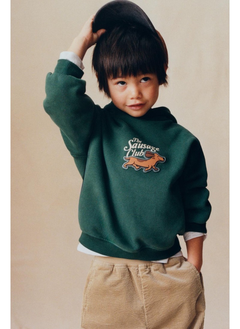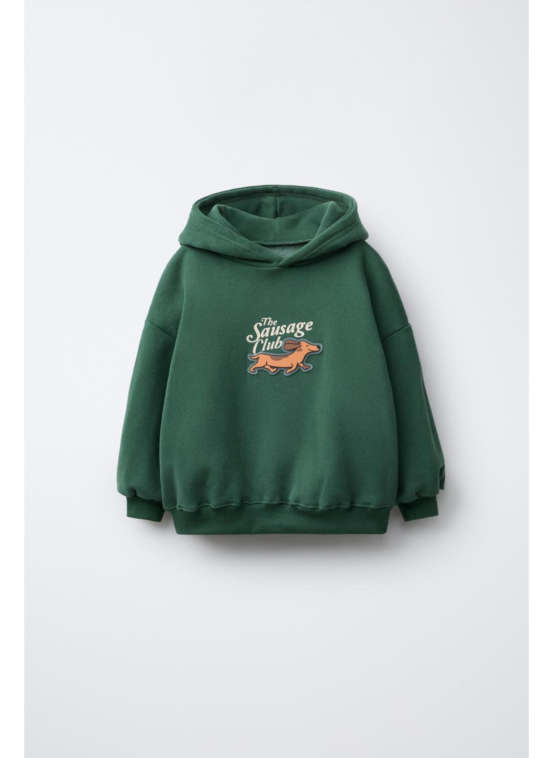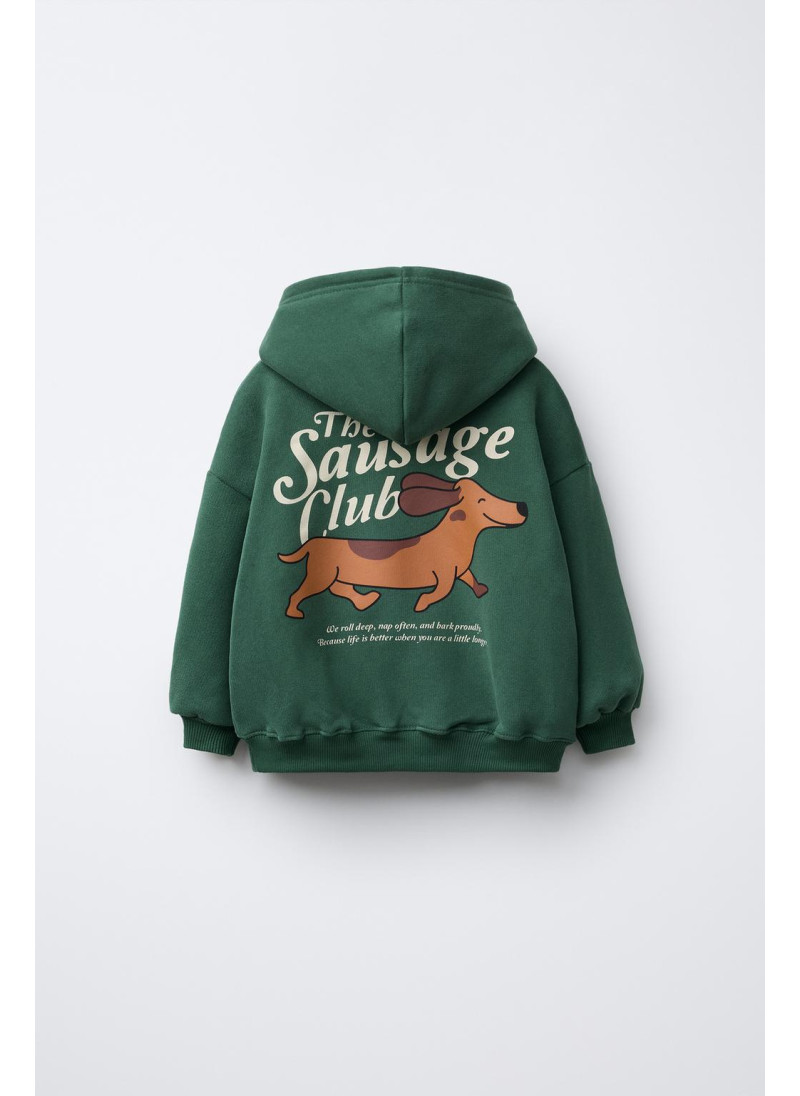 Худи с длинным рукавом. Ребристые манжеты. Пришитый на передней части принт таксы из резины и текстовый принт на спине. Мягкий ворсистый внутренний слой. Ткань с содержанием 82% хлопка.