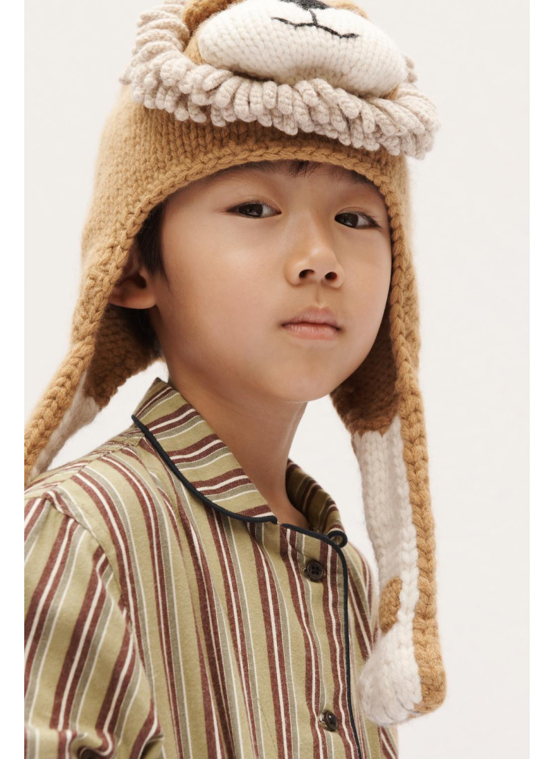 Шапка вязаная из 100% шерсти, мягкая и теплая на ощупь. Украшена нашивным изображением льва с объемной гривой. На боковых сторонах находятся ушки, выполненные в форме лап...