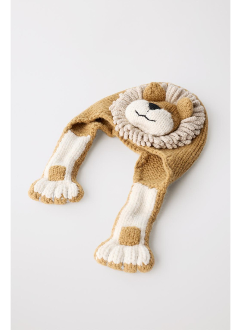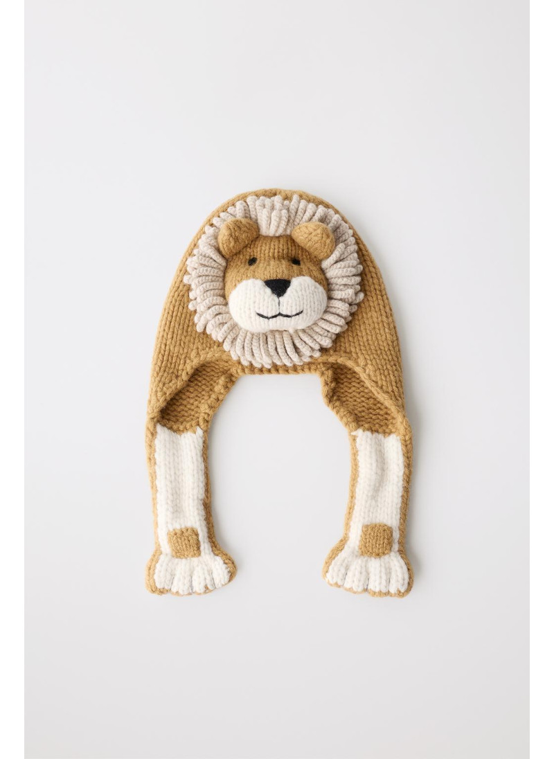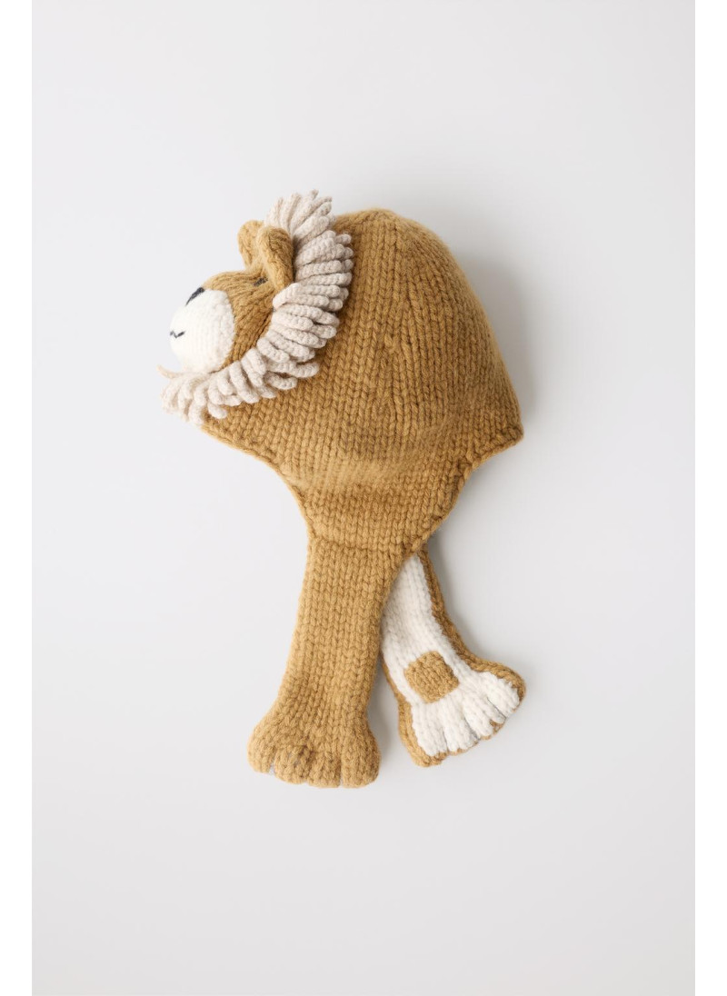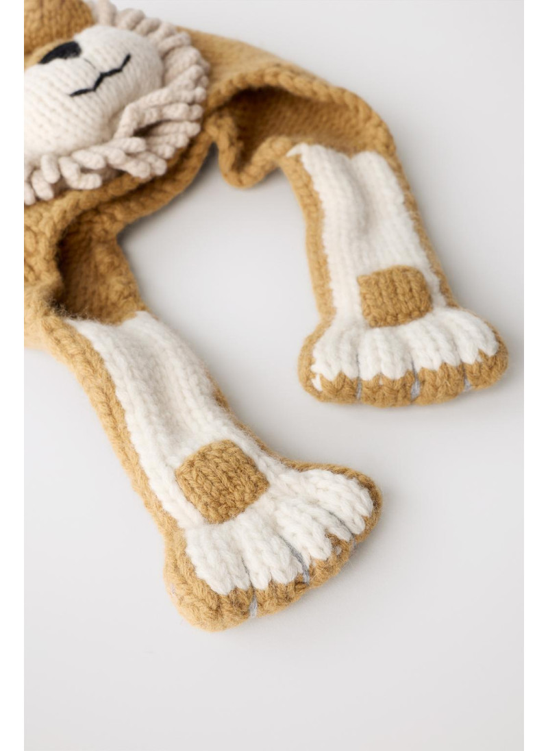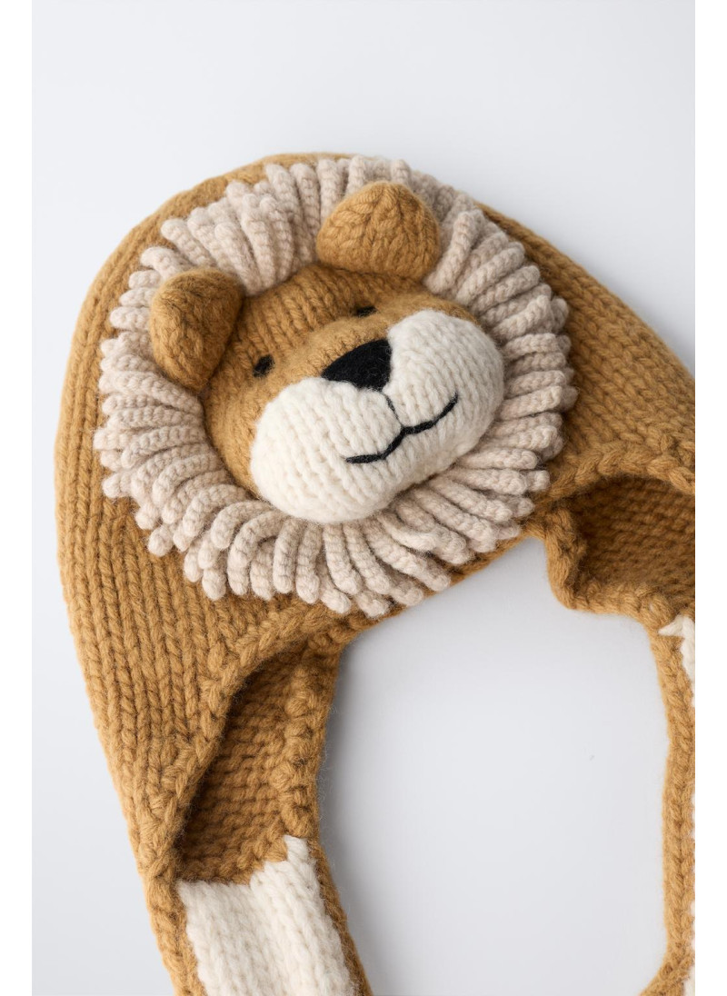 Шапка вязаная из 100% шерсти, мягкая и теплая на ощупь. Украшена нашивным изображением льва с объемной гривой. На боковых сторонах находятся ушки, выполненные в форме лап.