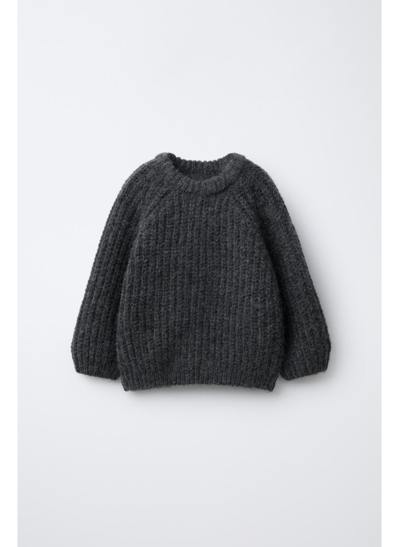 Свитер крупной вязки с круглым вырезом и длинными рукавами.