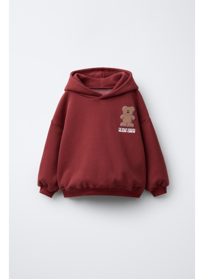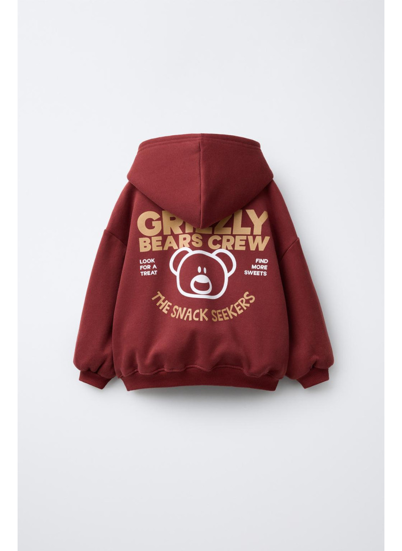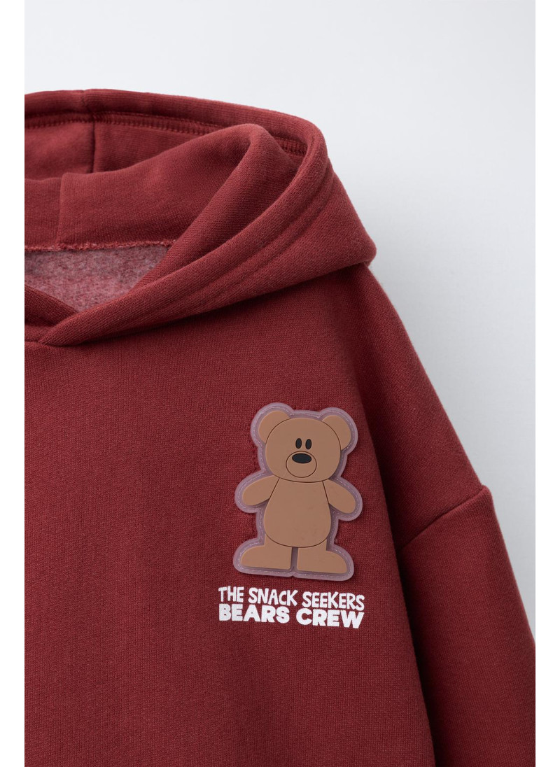 Длиннорукавная толстовка. Ребристые манжеты. Накладной аппликация в виде медвежонка на груди и надпись на спине. Мягкая ткань с начёсом из 82% хлопка.