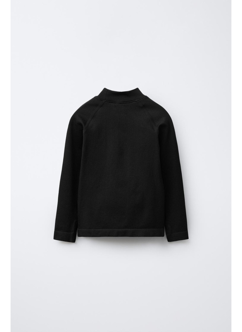 Футболка с ребристым узором, высоким воротником и длинным рукавом с петлями для большого пальца. Украшена объемным текстовым элементом на подоле...