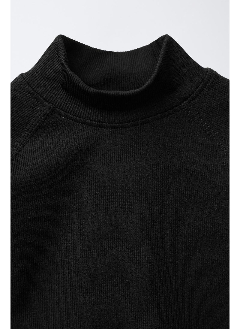 Футболка с ребристым узором, высоким воротником и длинным рукавом с петлями для большого пальца. Украшена объемным текстовым элементом на подоле.