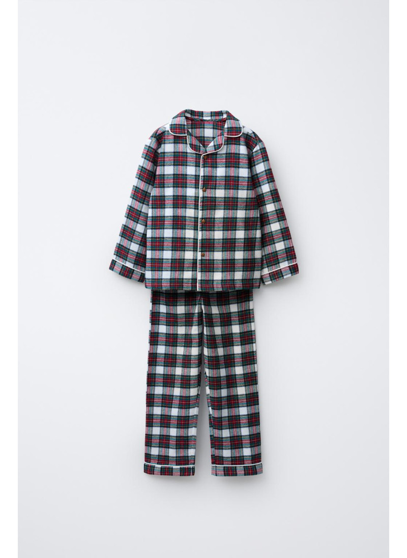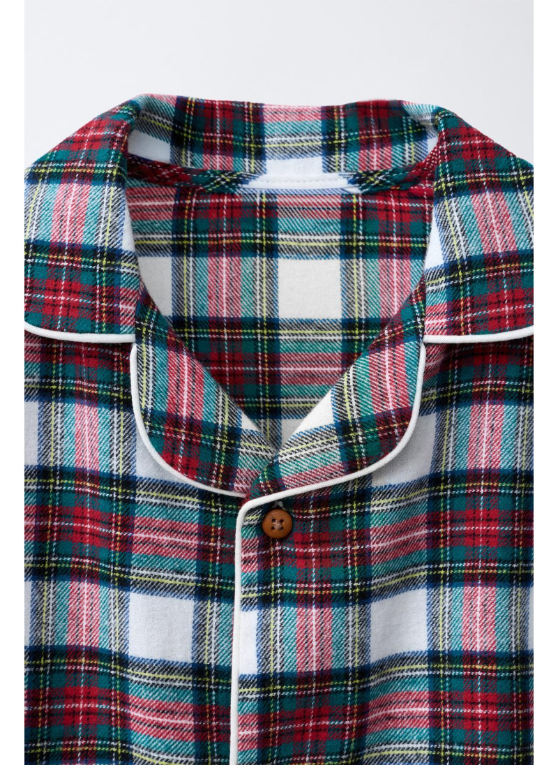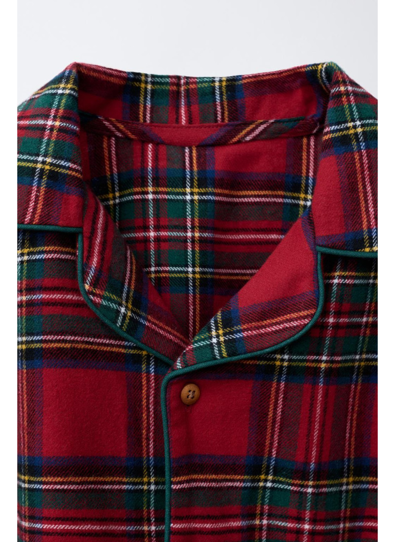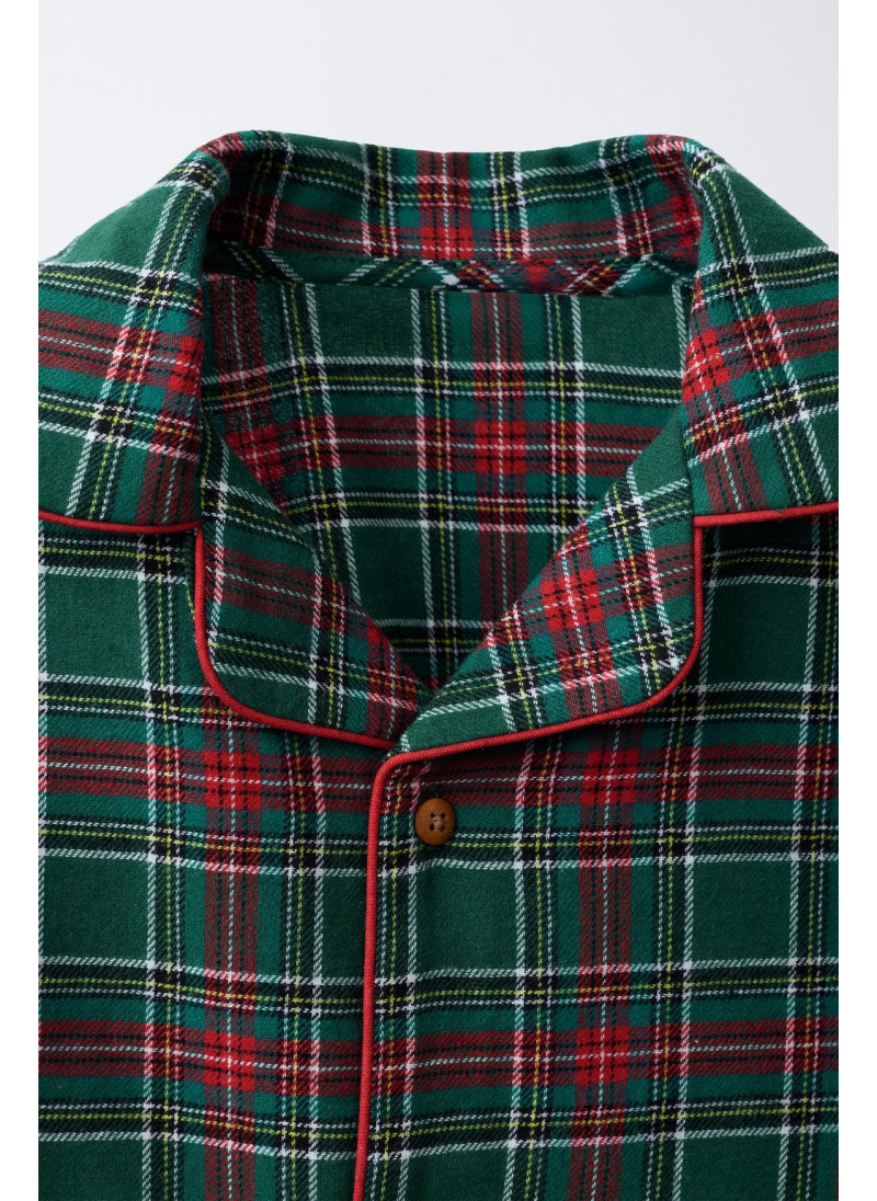 Пижама из двух предметов. Рубашка с отложным воротником и длинными рукавами. Застежка на пуговицах спереди. Брюки с эластичным поясом. Яркие детали контрастного цвета и принт в клетку.