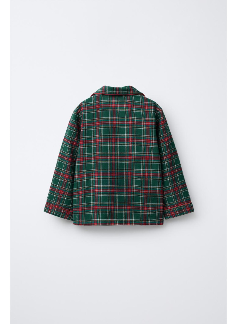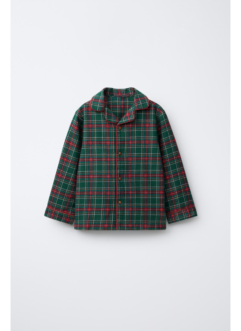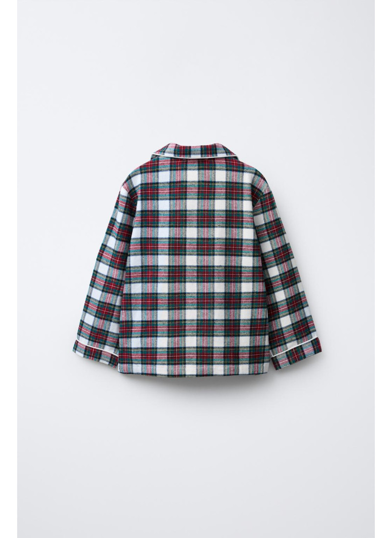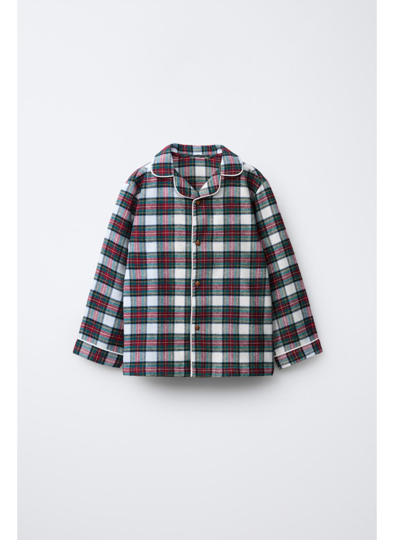 Пижама из двух предметов. Рубашка с отложным воротником и длинными рукавами. Застежка на пуговицах спереди. Брюки с эластичным поясом. Яркие детали контрастного цвета и принт в клетку.