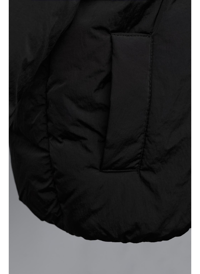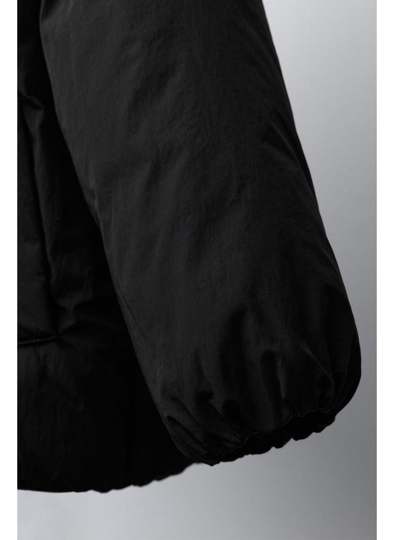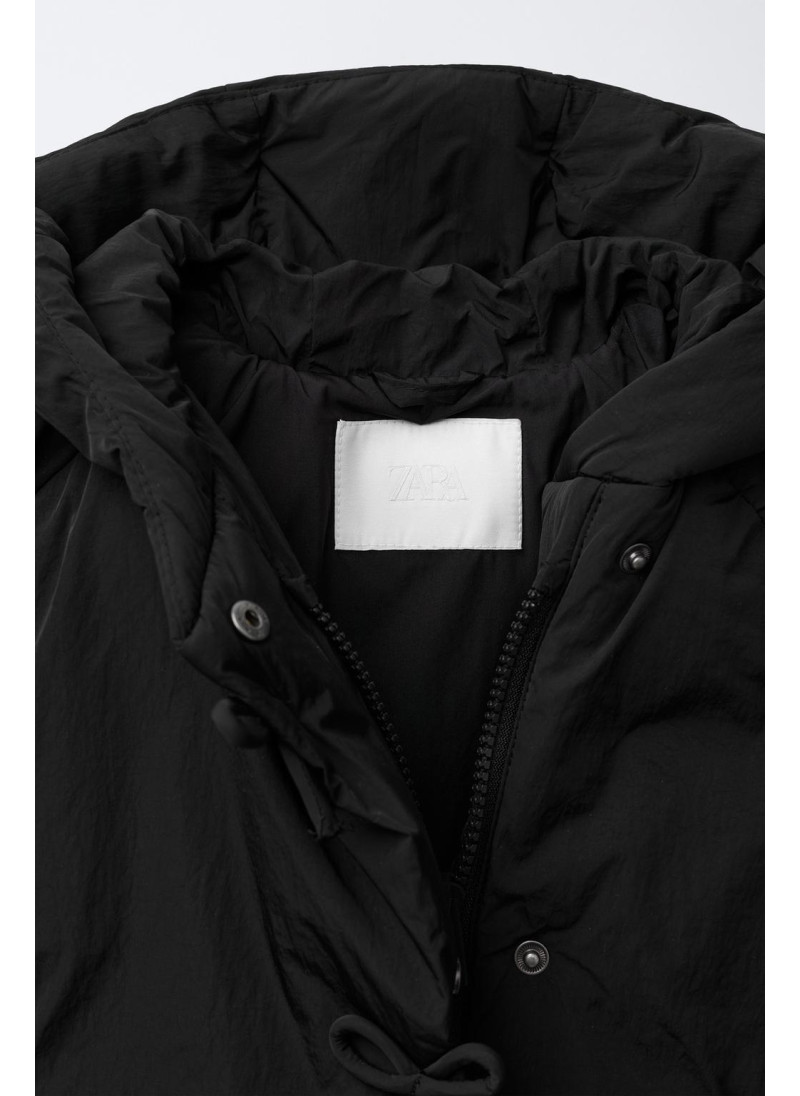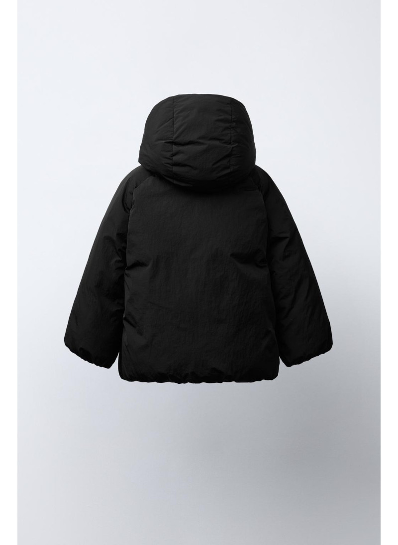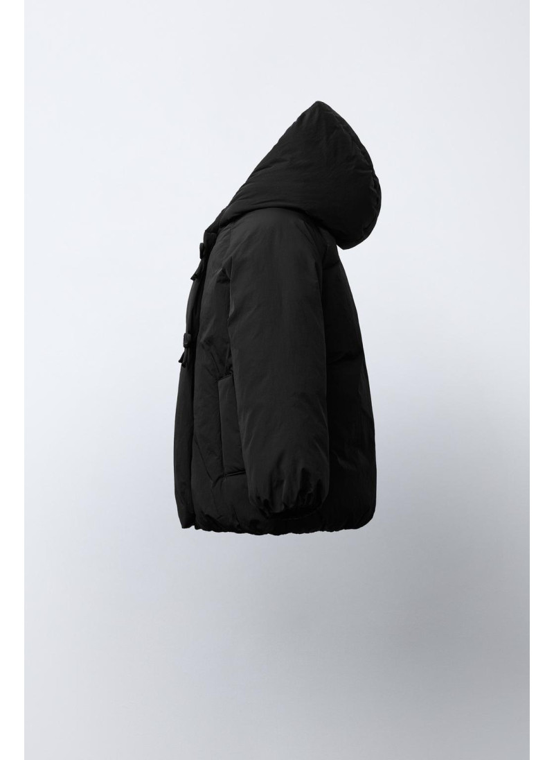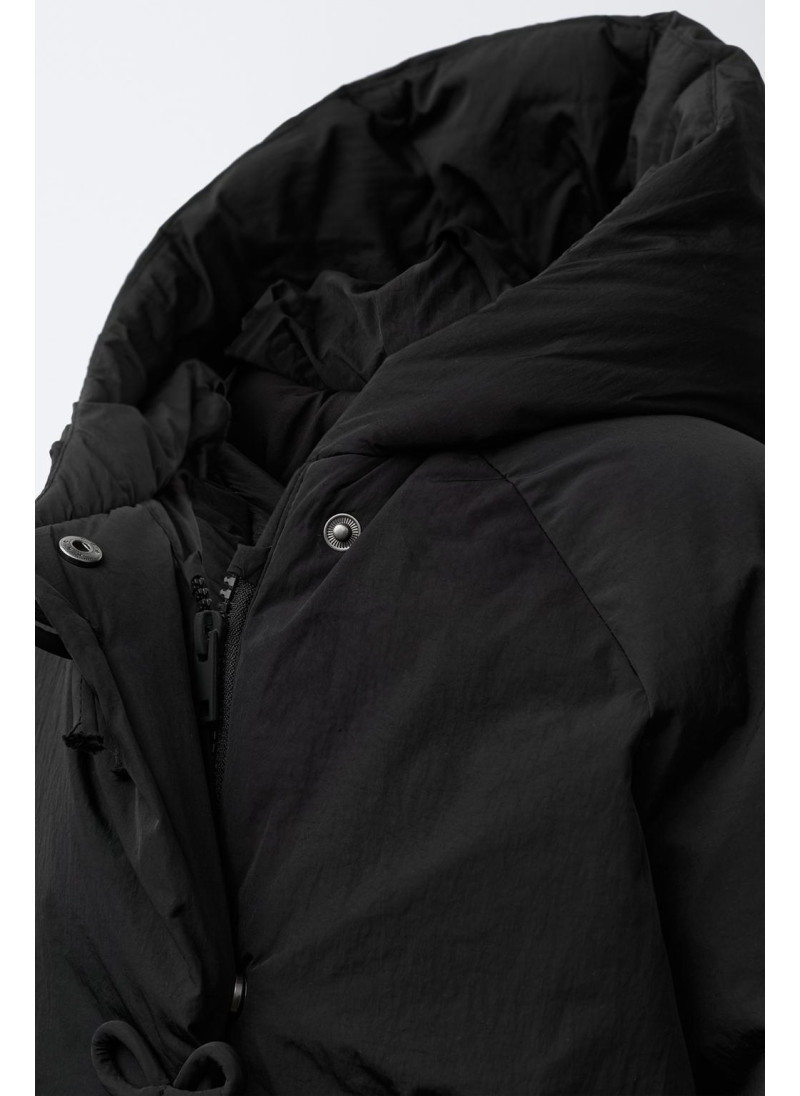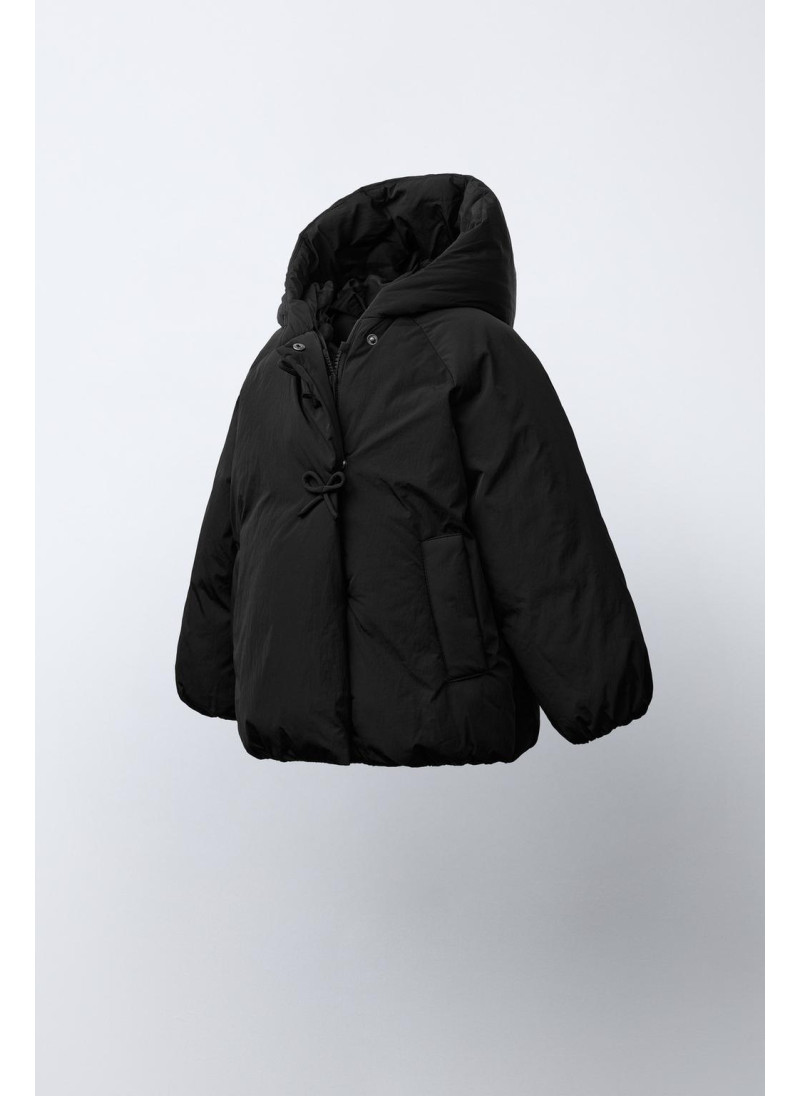 Пальто с капюшоном, высоким воротником и длинными рукавами на резинке. Скрытая молния под планкой и кнопки сбоку с бантами. Передние прорезные карманы. Низ на резинке.