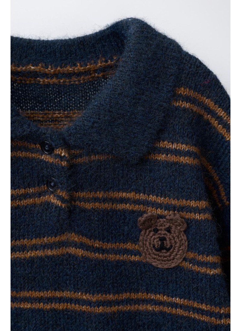 Вязаный джемпер с воротником поло и длинными рукавами с манжетами. Застежка на пуговицы спереди. Аппликация «Медведь» из кружева кроше на груди...