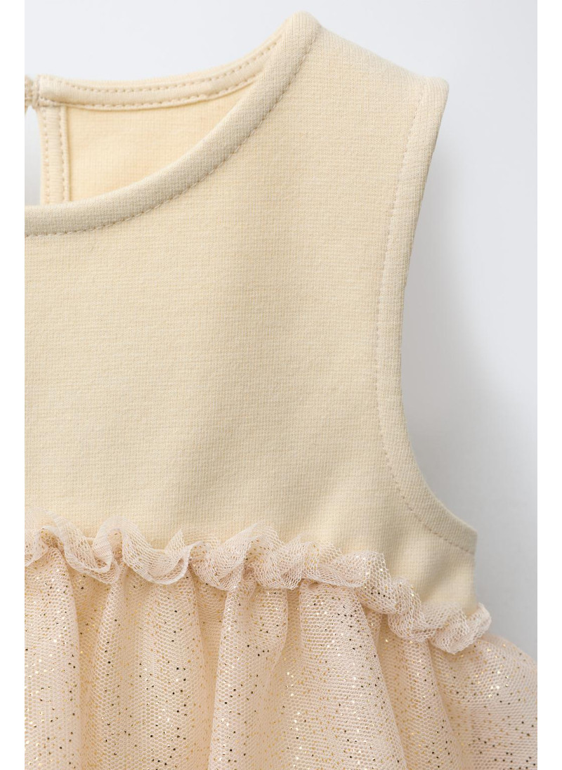Комбинированное платье с круглым вырезом и рукавами без пройм. Застежка на пуговицу-капельку сзади. Юбка из полупрозрачной ткани с блестящими деталями. Подкладка в тон...