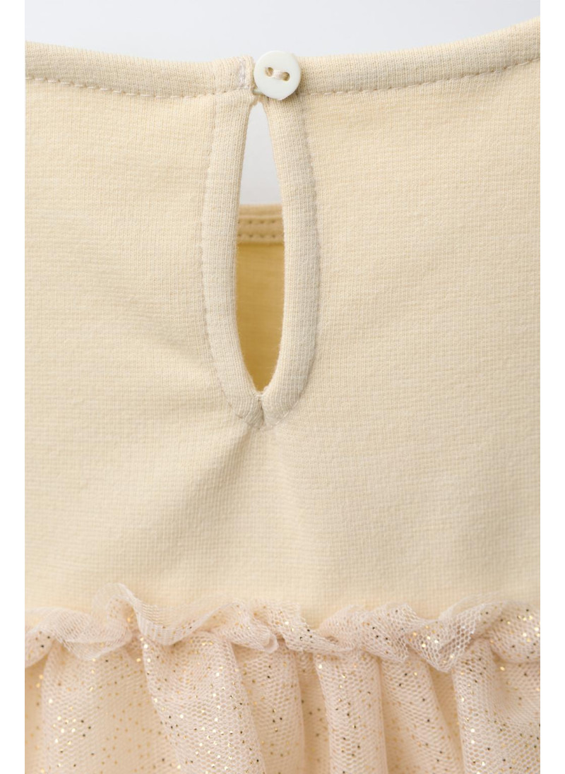 Комбинированное платье с круглым вырезом и рукавами без пройм. Застежка на пуговицу-капельку сзади. Юбка из полупрозрачной ткани с блестящими деталями. Подкладка в тон.