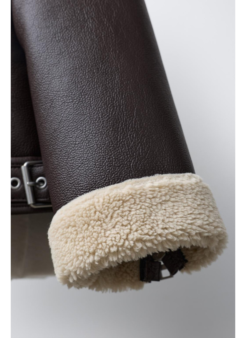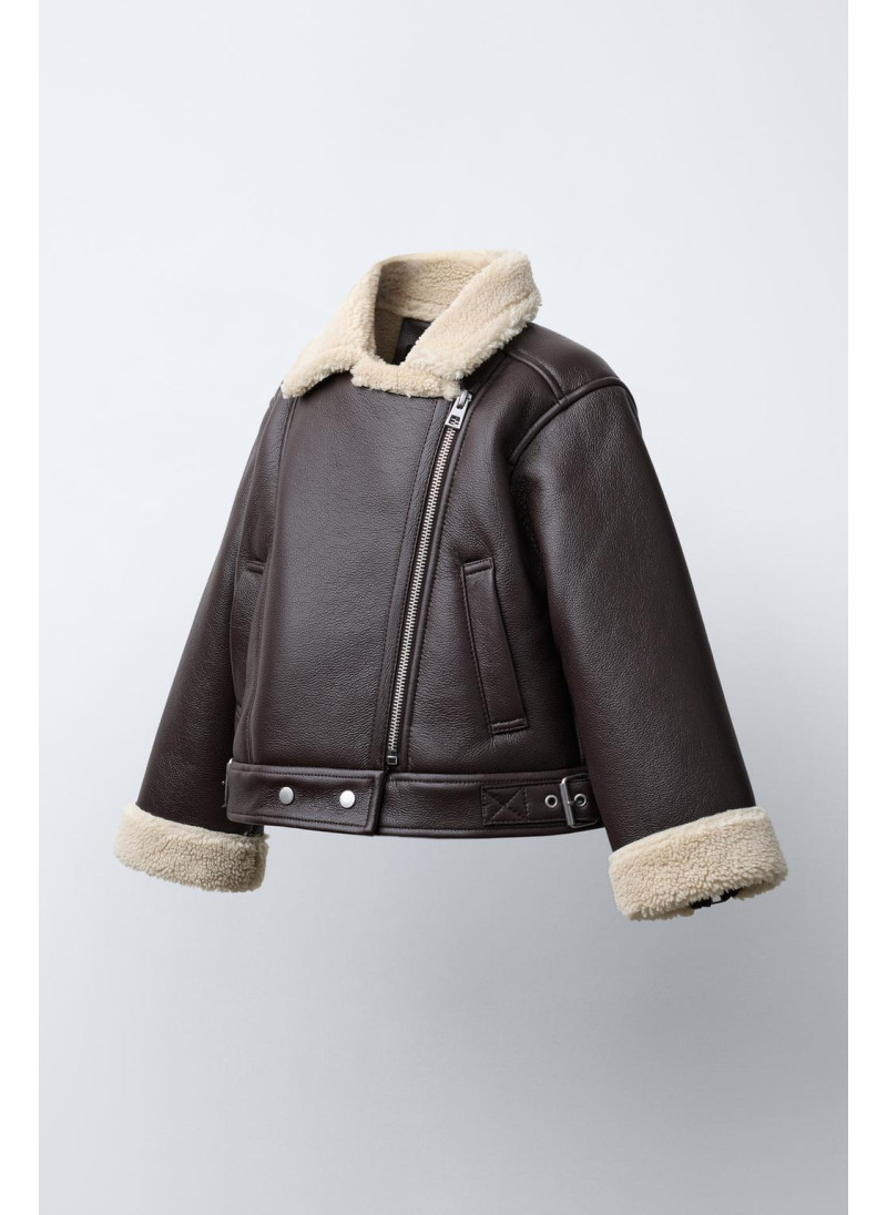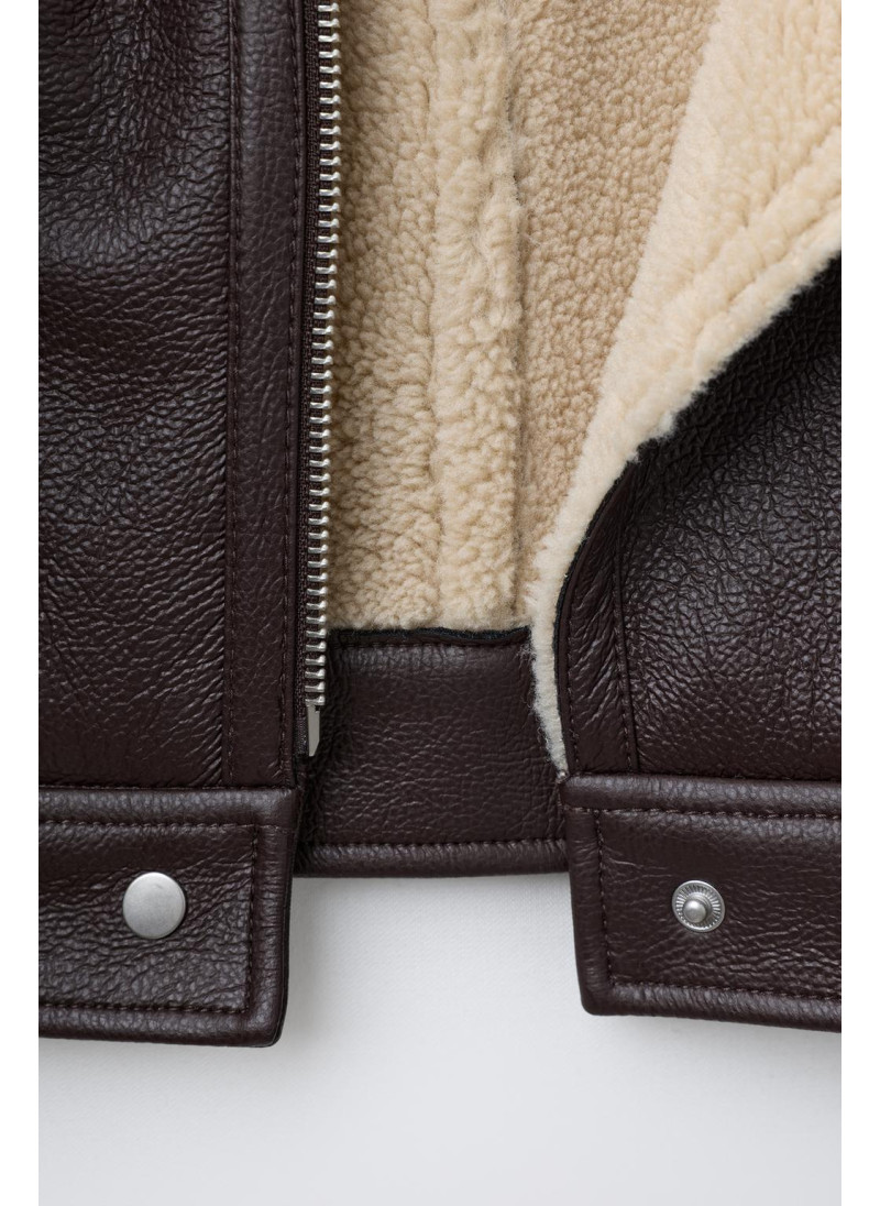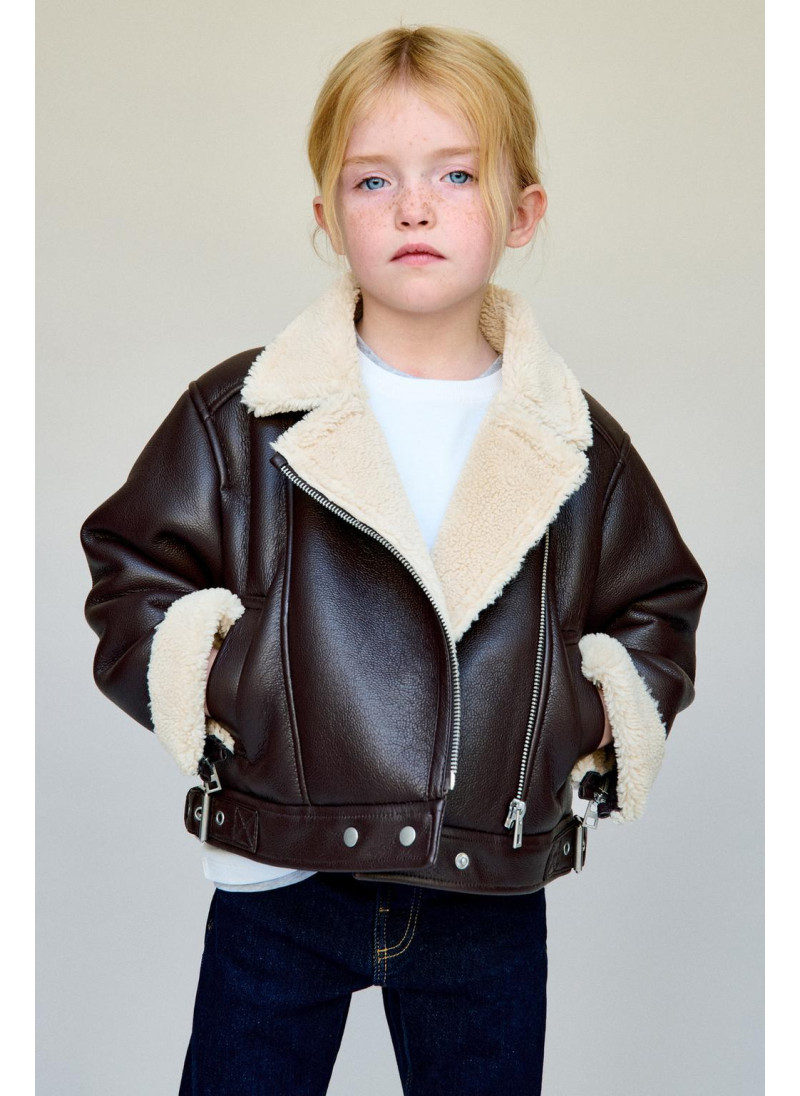 Куртка в байкерском стиле с воротником с лацканами и длинными рукавами с отворотами. Застежка-молния на запáхе. Передние прорезные карманы. Пряжки по нижнему краю и подкладка из искусственной овчины.