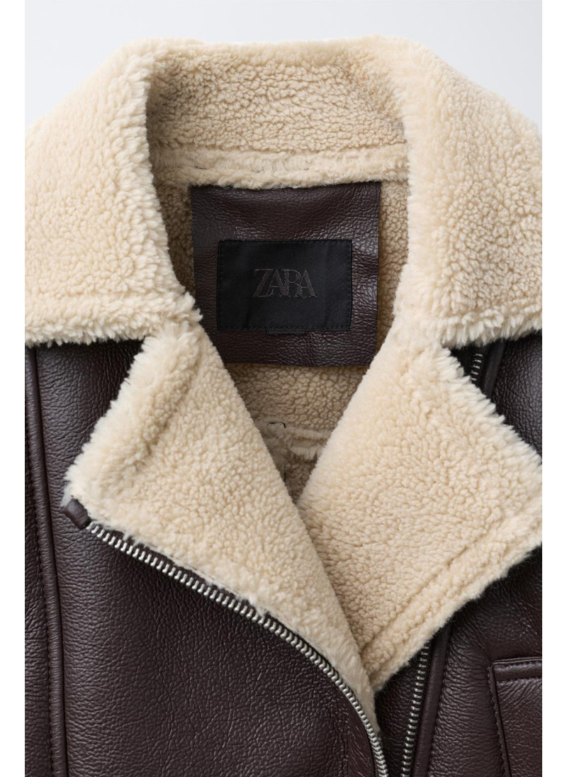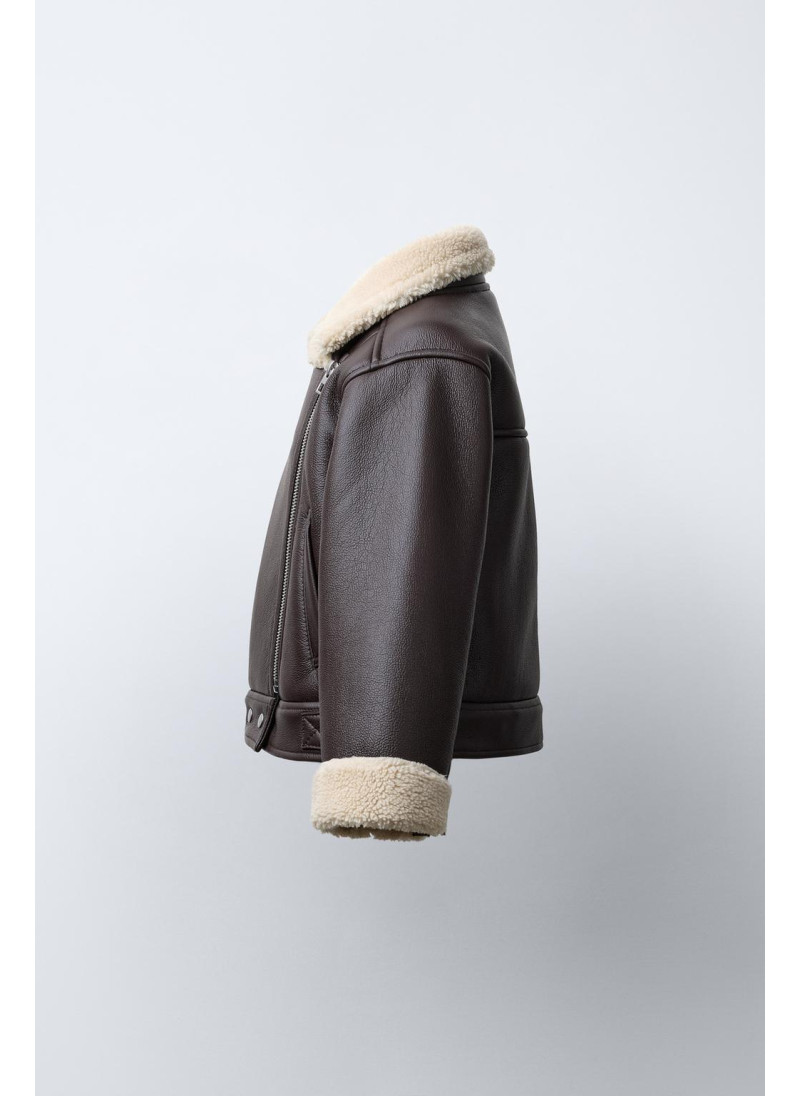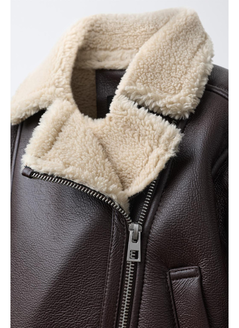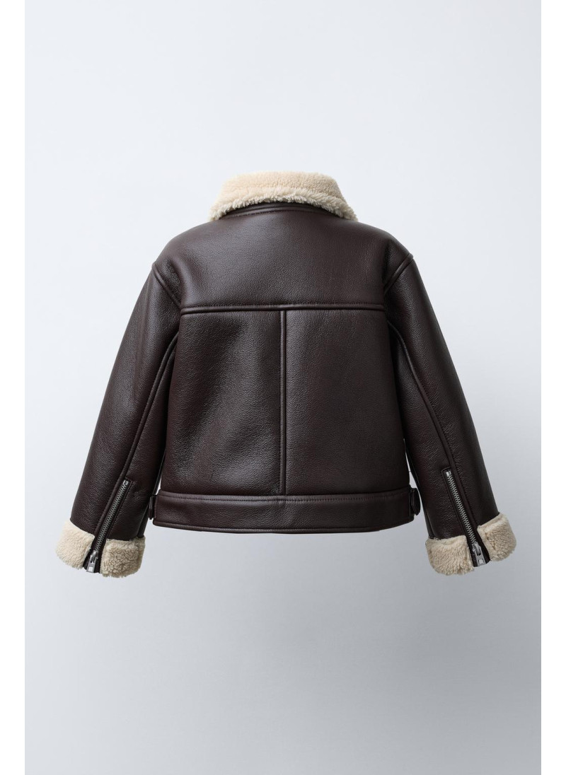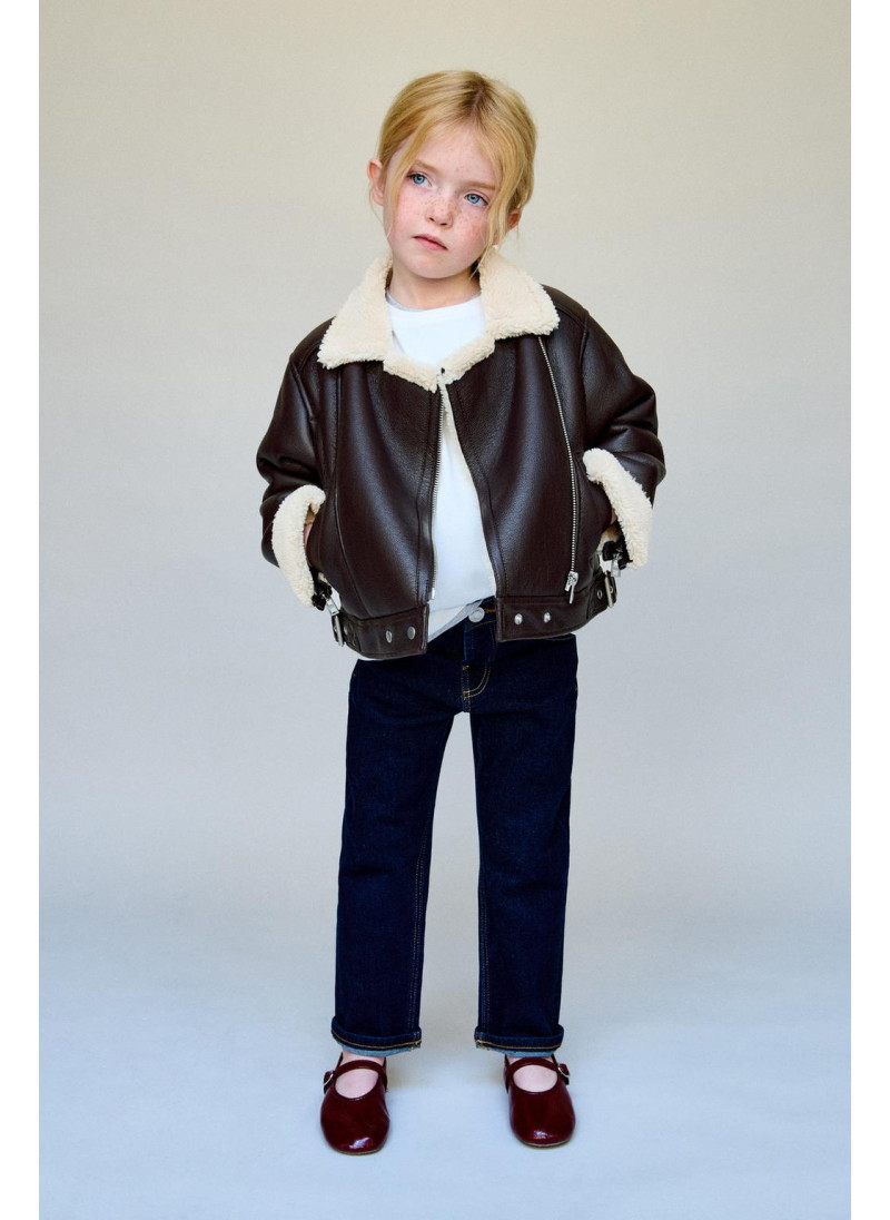 Куртка в байкерском стиле с воротником с лацканами и длинными рукавами с отворотами. Застежка-молния на запáхе. Передние прорезные карманы. Пряжки по нижнему краю и подкладка из искусственной овчины.