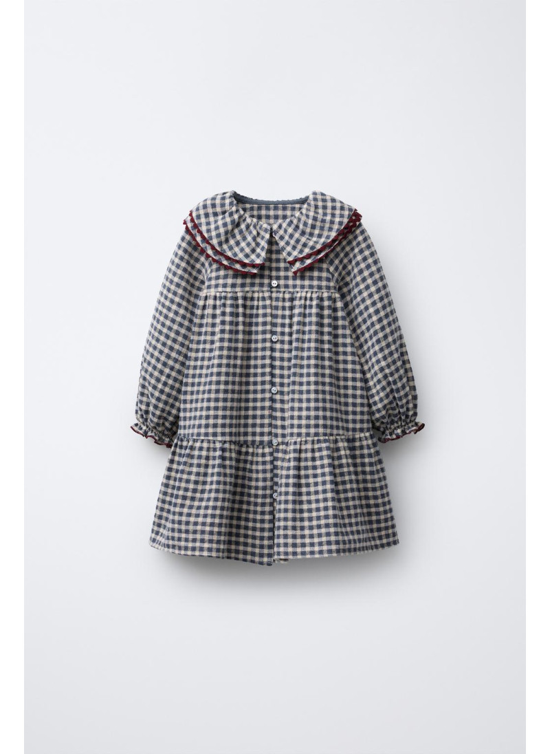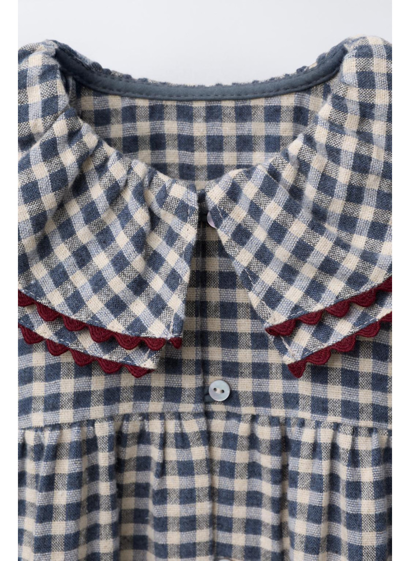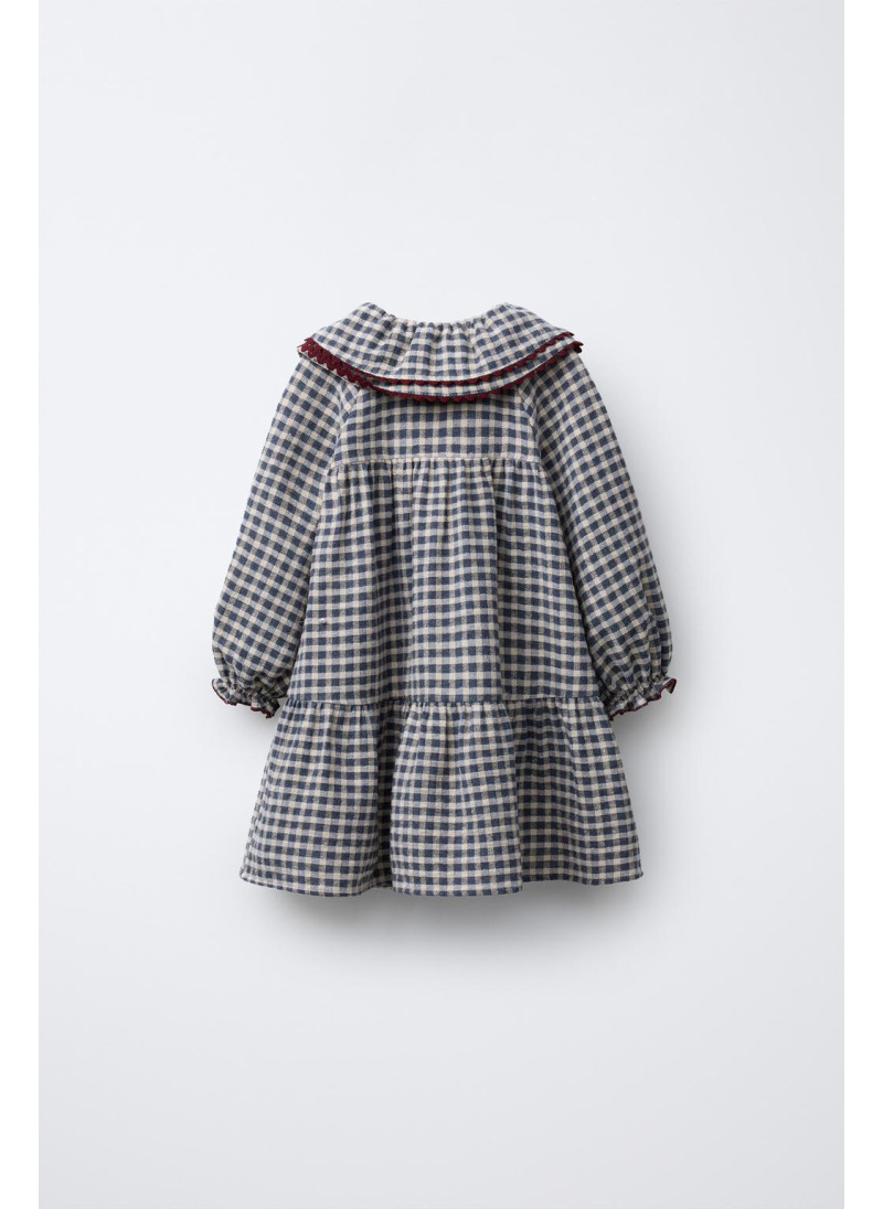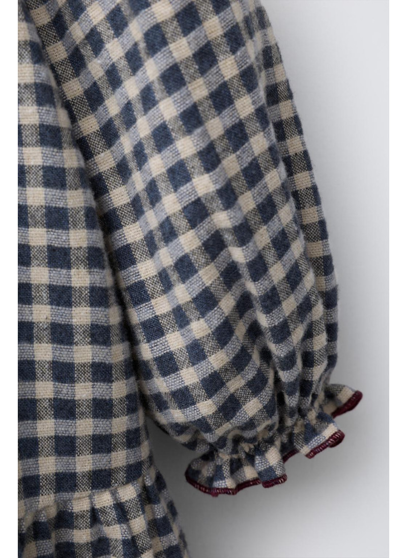 Платье с двойным круглым воротником и волнистой оторочкой контрастного цвета. Длинные рукава с эластичными манжетами. Застежка на пуговицы в виде капли спереди. Принт в клетку.