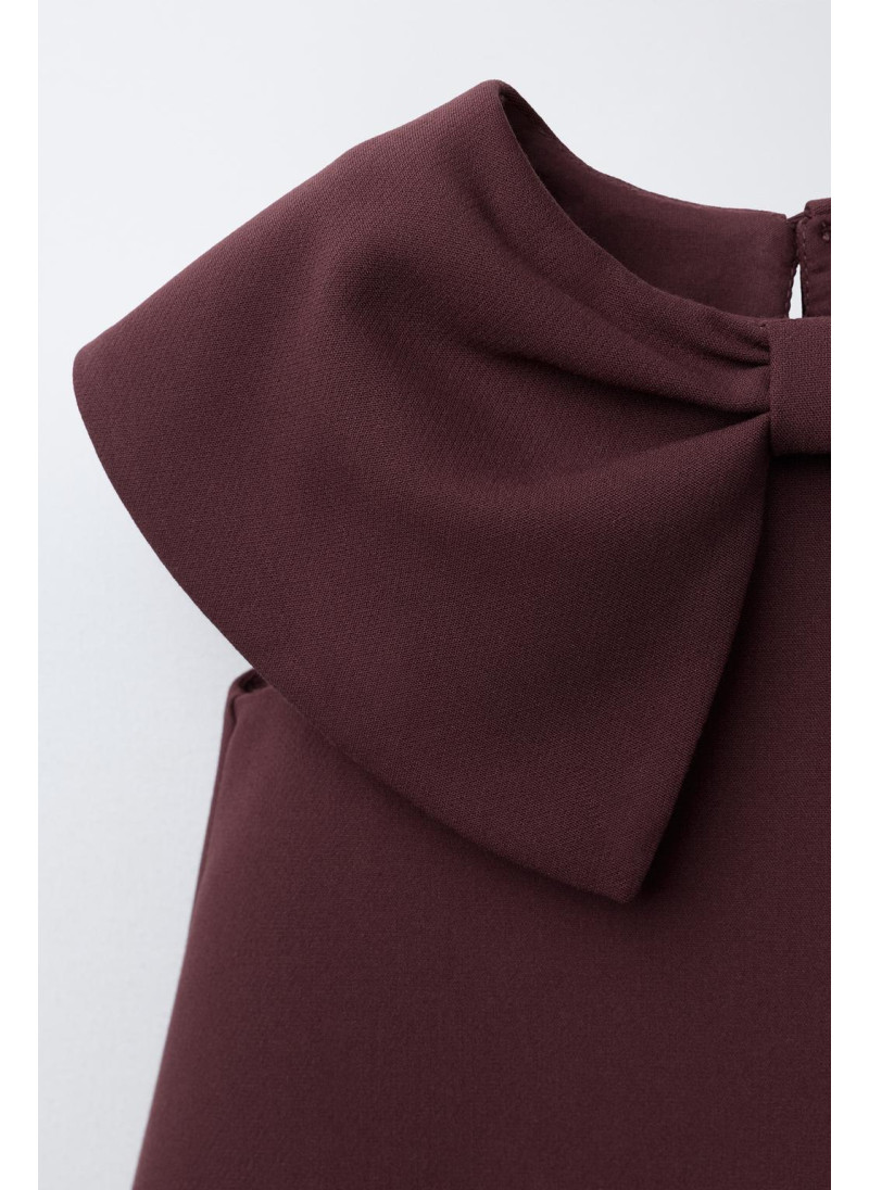 Платье с круглым вырезом и без рукавов. Каплевидный вырез с пуговицей сзади. Бант спереди.