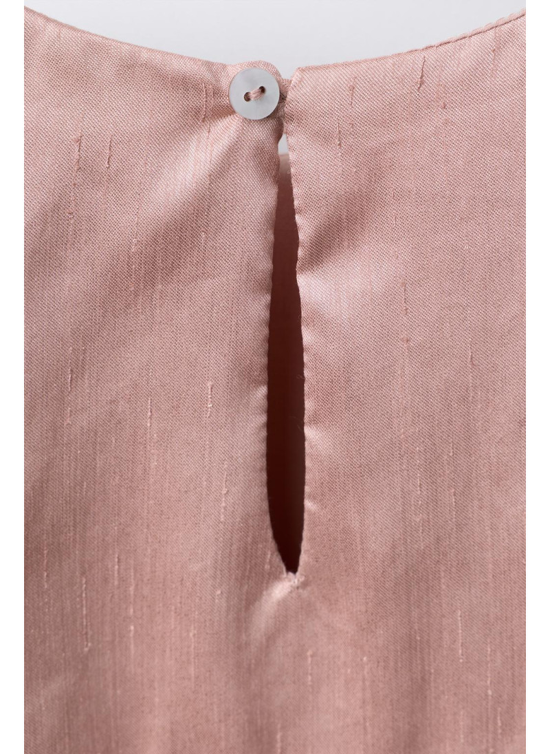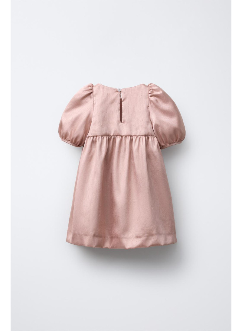 Платье с круглым вырезом и короткими объемными рукавами. Каплевидный вырез с пуговицей сзади. Разрезы на груди и блестящие детали. Подкладка в тон.