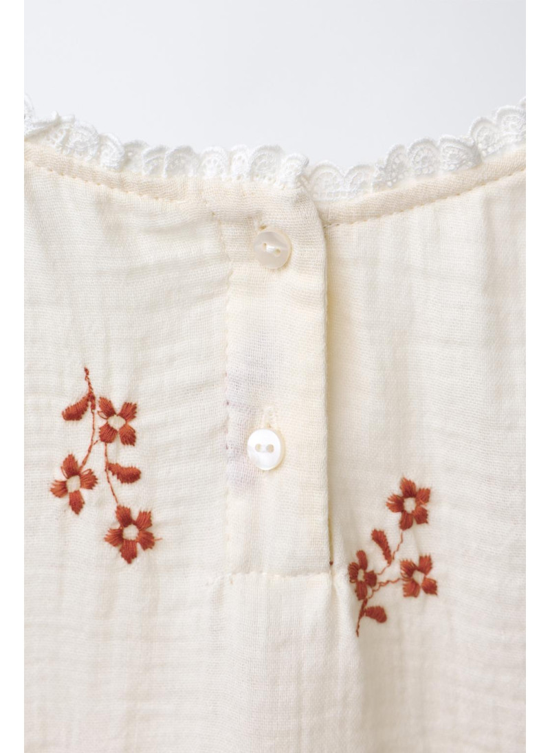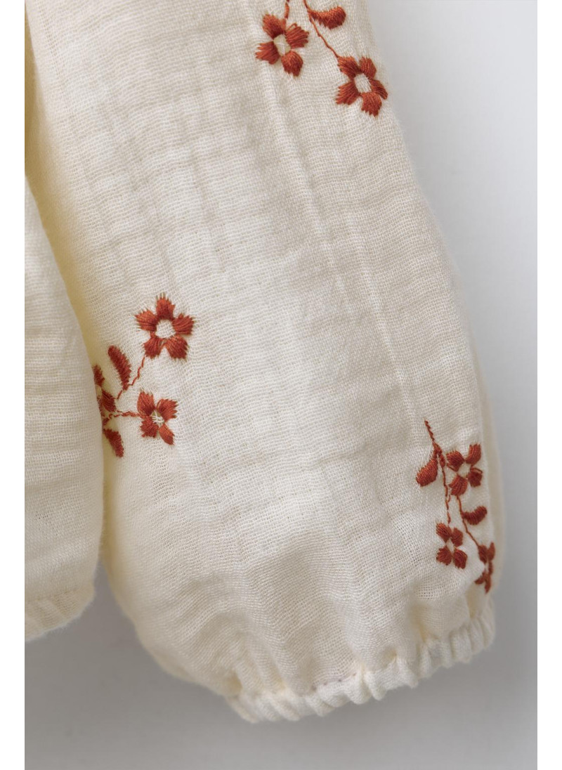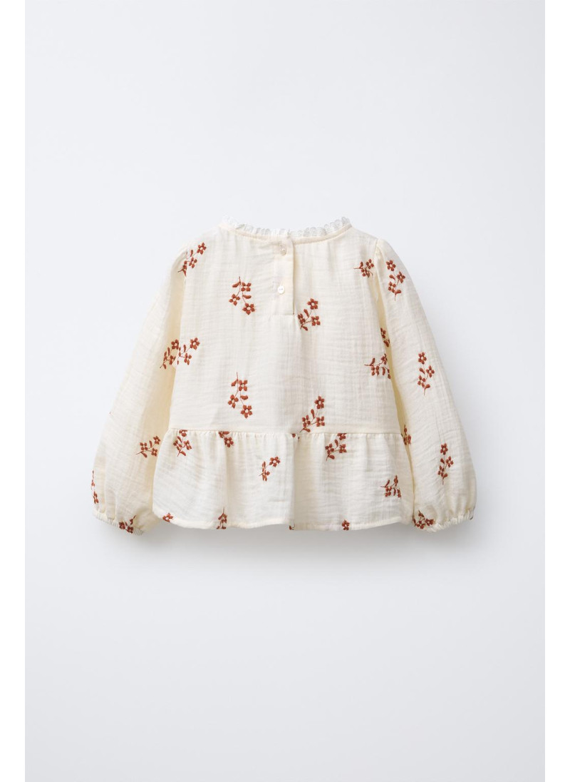 Блуза с круглым вырезом, кружевной отделкой и длинными рукавами на резинке. Застежка на пуговицы сзади. Декоративная вышивка в виде цветов.