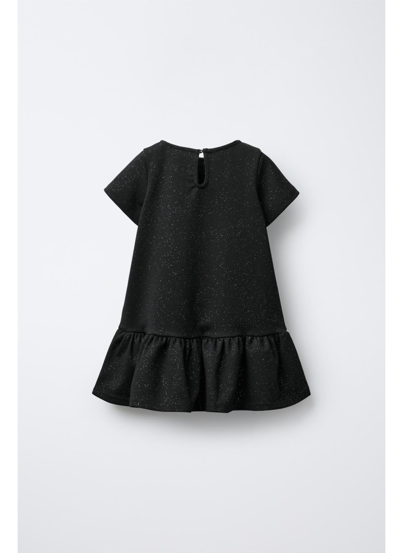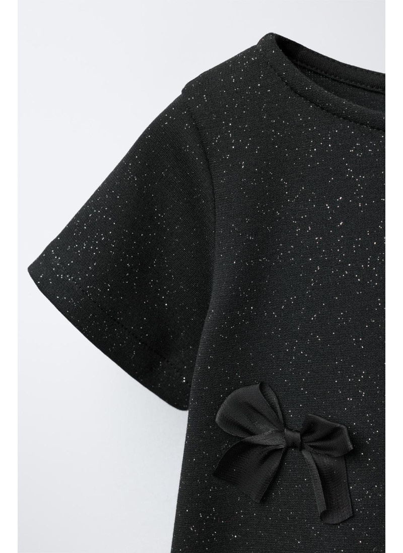 Платье из трикотажа «рома» с круглым вырезом и короткими рукавами. Застежка на пуговицу-капельку на спине. Детали с блестками. Аппликация в виде бантов спереди и оборка по низу.