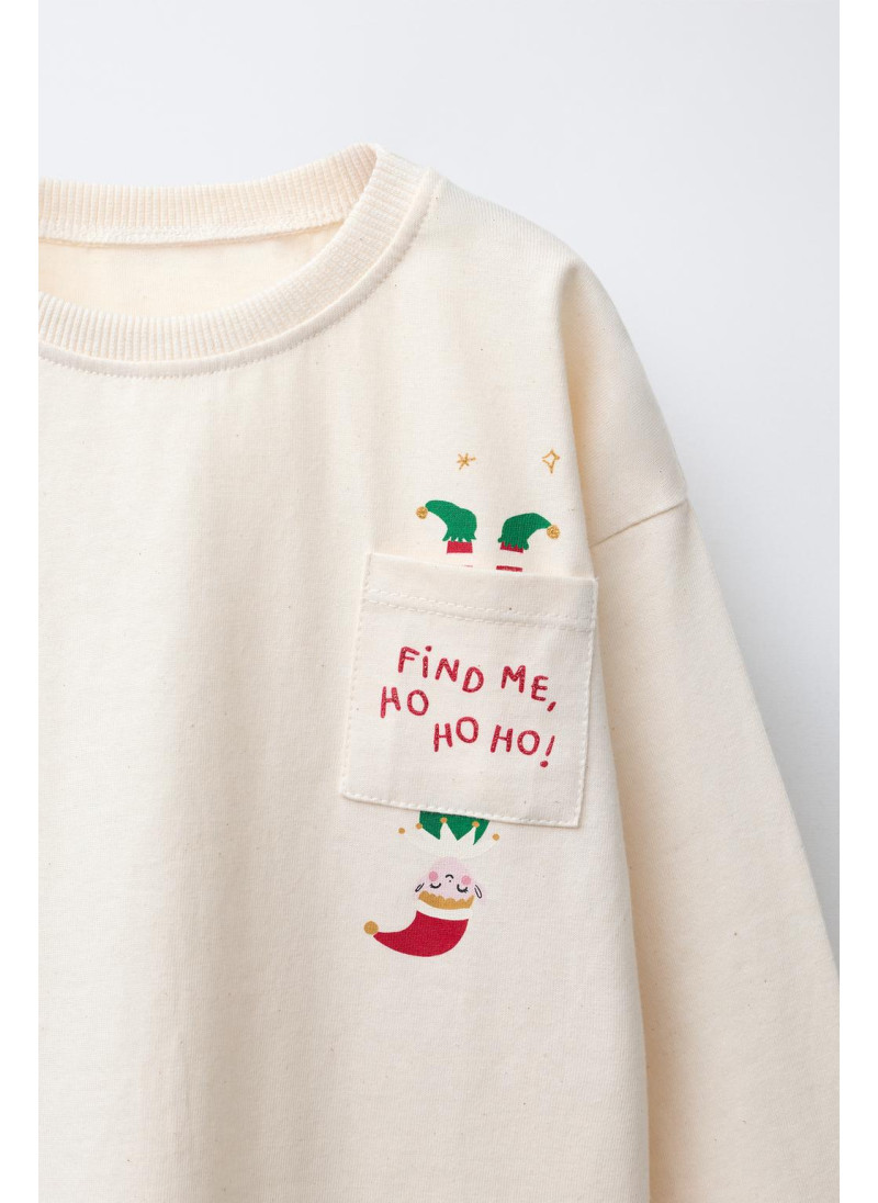 Футболка с длинным рукавом и круглым вырезом горловины. Имеет накладной карман на груди. Принт с эльфами и блестками спереди. Изготовлена из 100% хлопковой ткани.