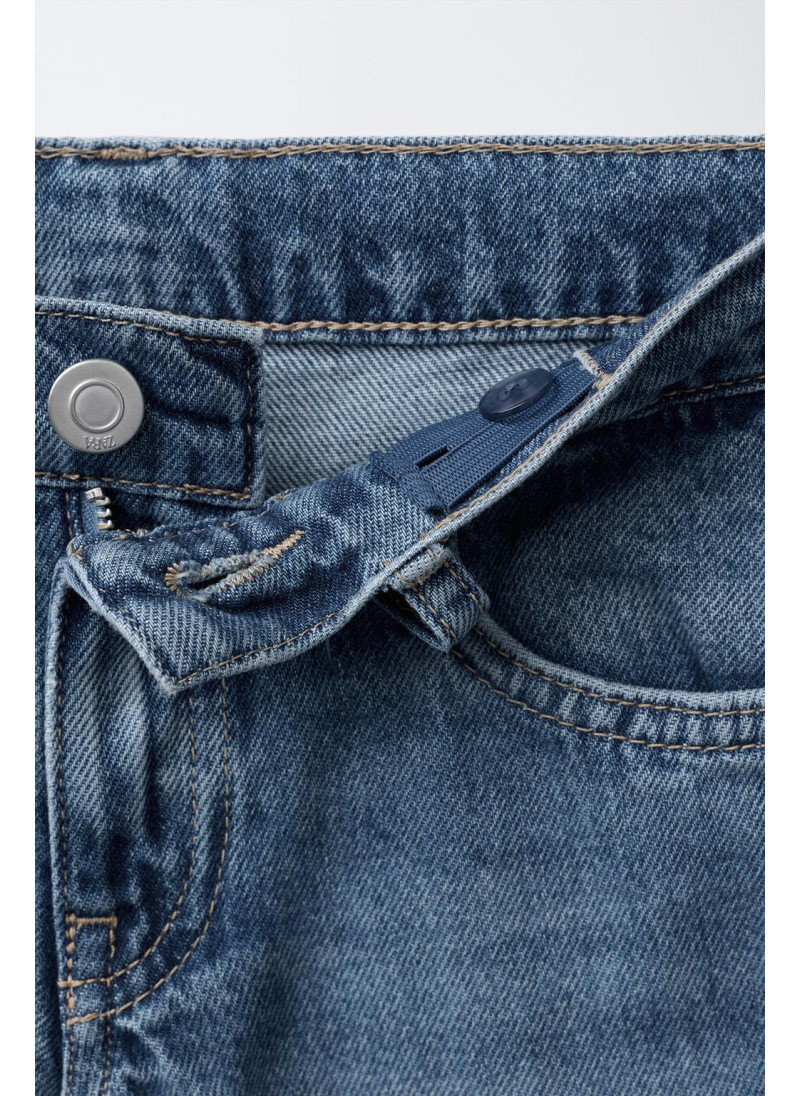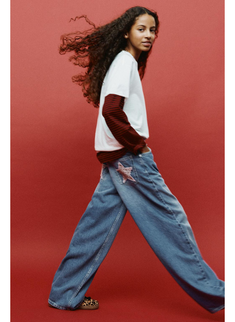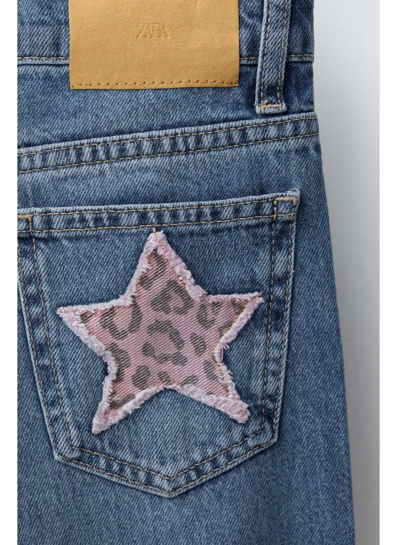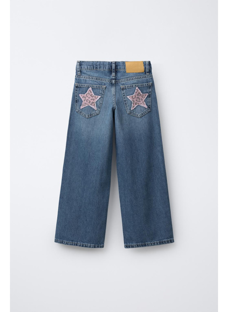 Джинсы с широкими штанинами с регулируемой внутренней талией и застежкой на пуговицу спереди. Передние карманы и накладные карманы на задней части с нашивками в виде звезд с животным принтом.
