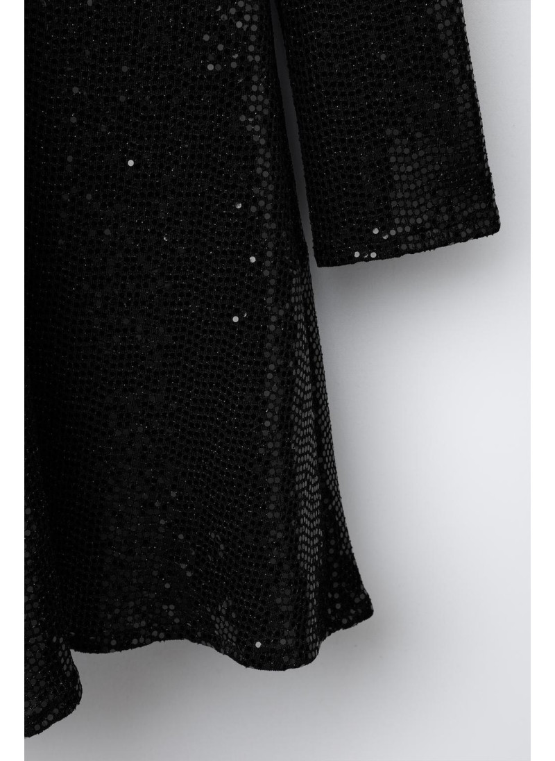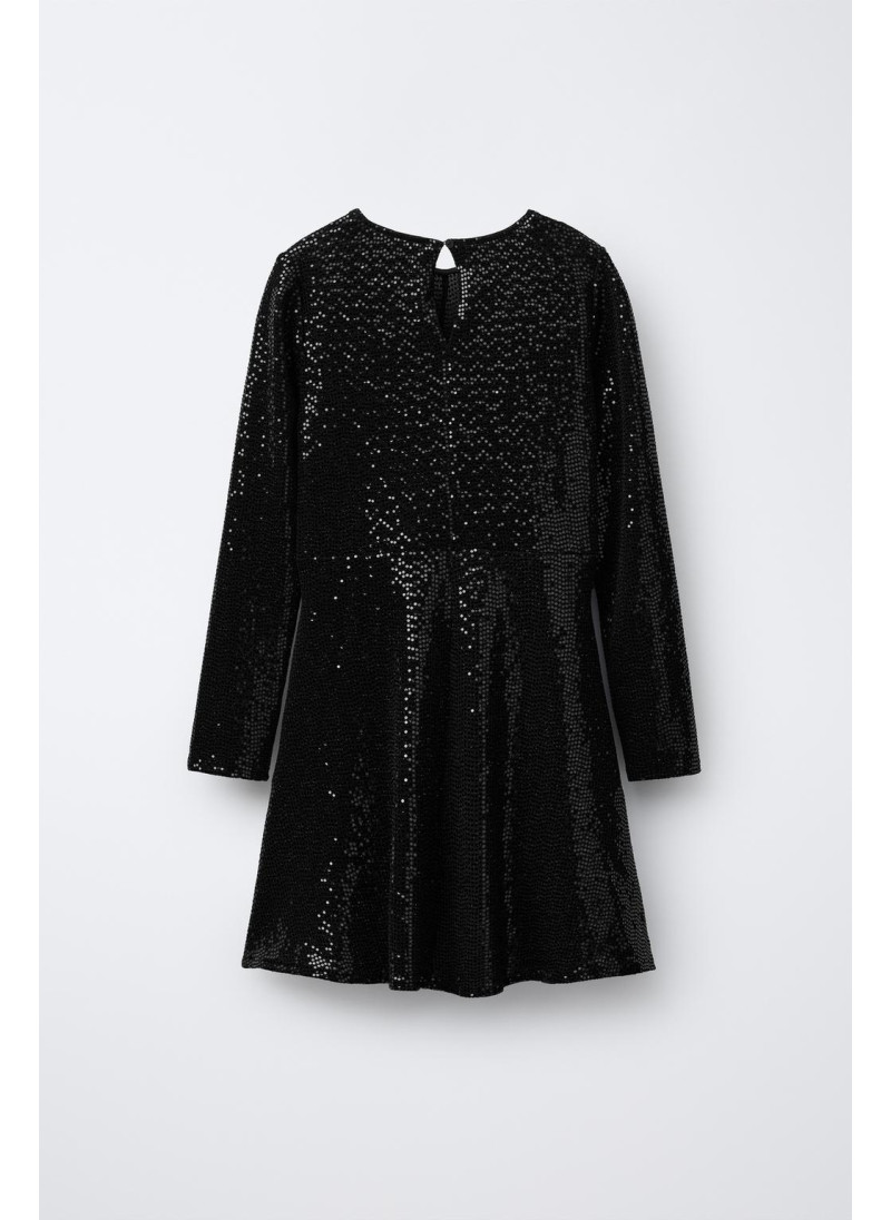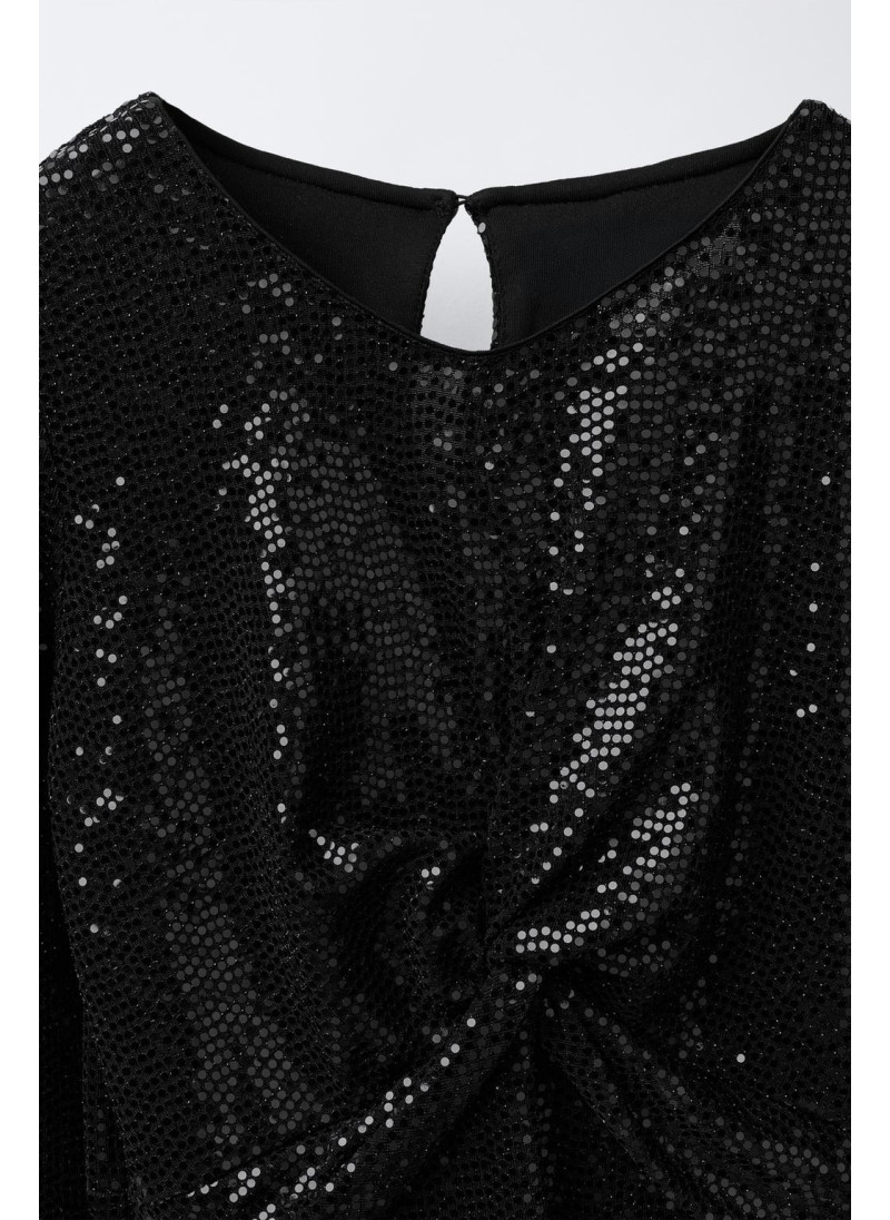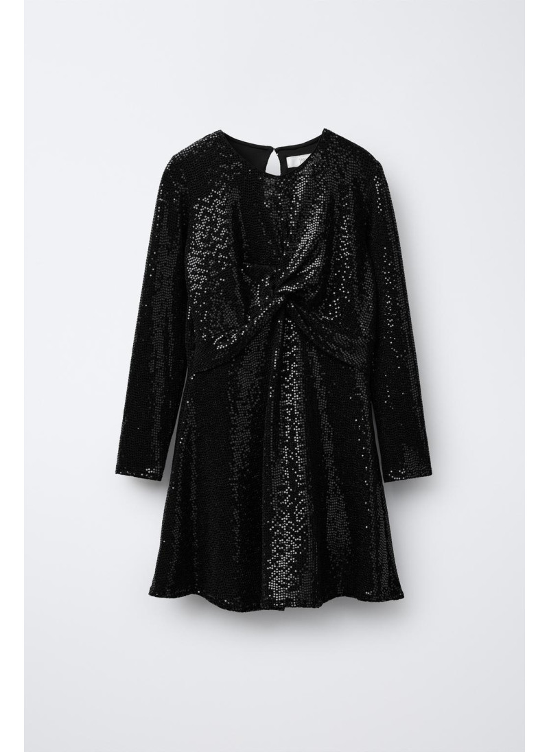 Платье с круглым вырезом и длинными рукавами. Имеет каплевидное отверстие с пуговицей на спине, аппликацию узелка спереди и блестящие детали. Модель ростом 165 см носит размер 12-13 лет.