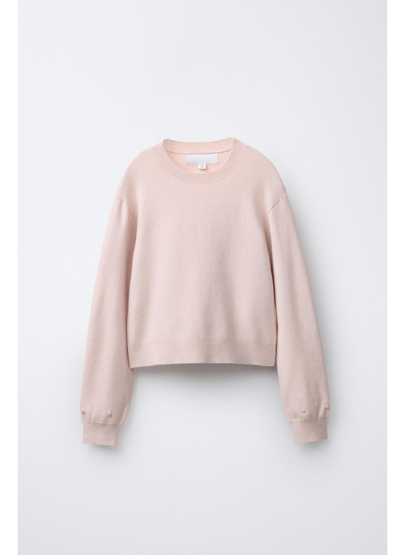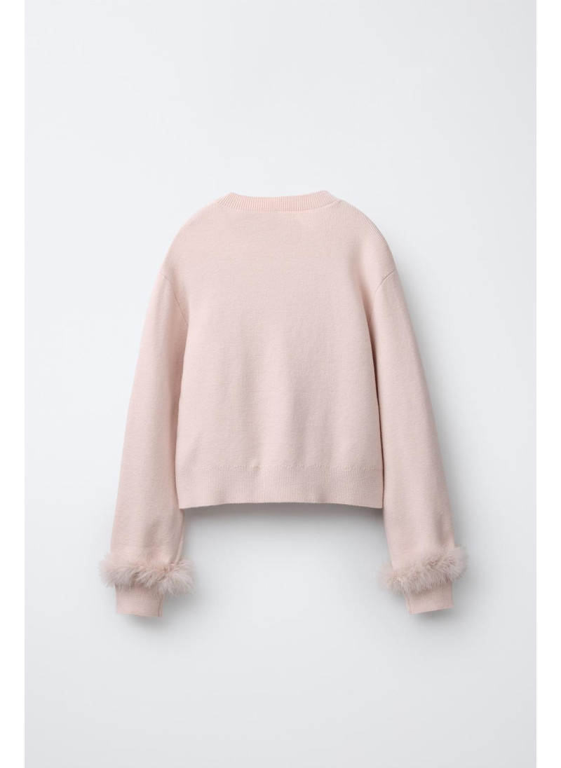 Пуловер из вязаного полотна с круглым вырезом и длинными рукавами. На манжетах есть нашивка из перьев с застежкой на пуговицу.