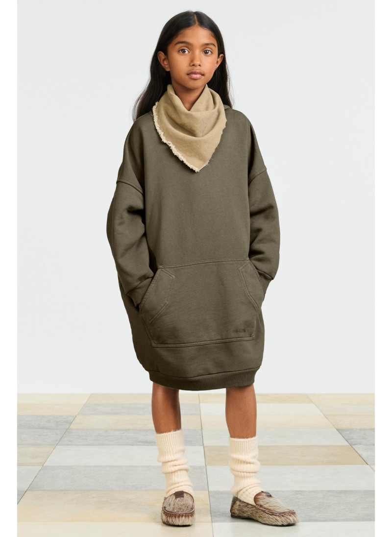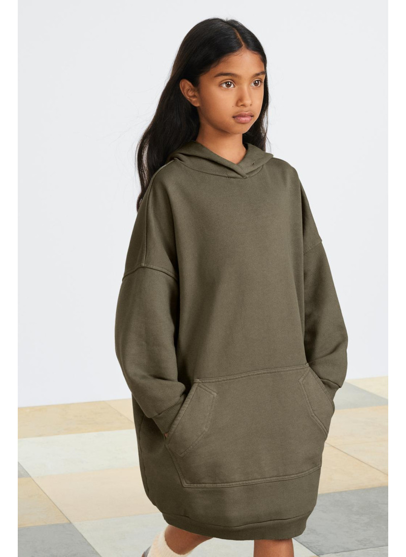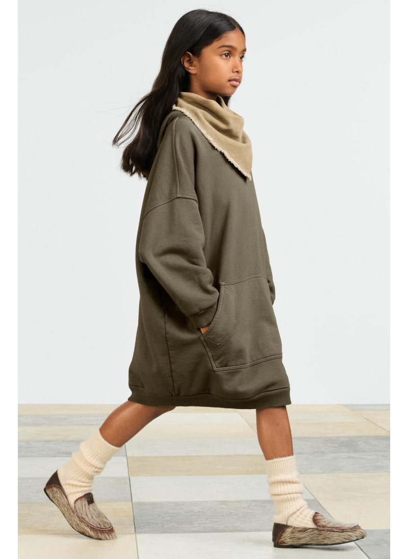 Плюшевое платье с капюшоном и манжетами три четверти. карман-кенгуру спереди. эластичный низ. ткань 100% хлопок.