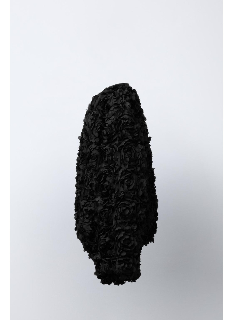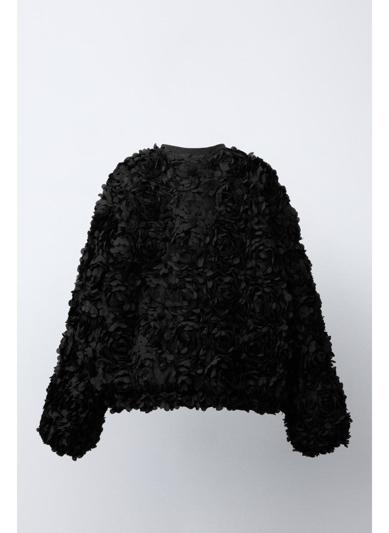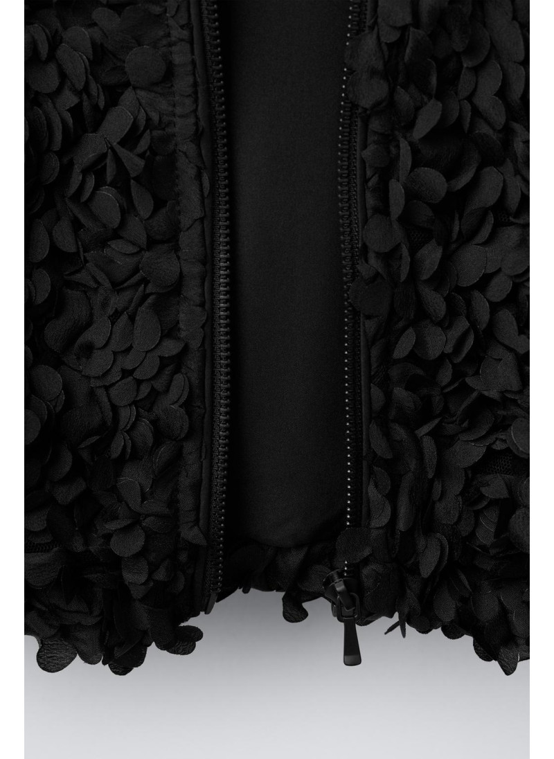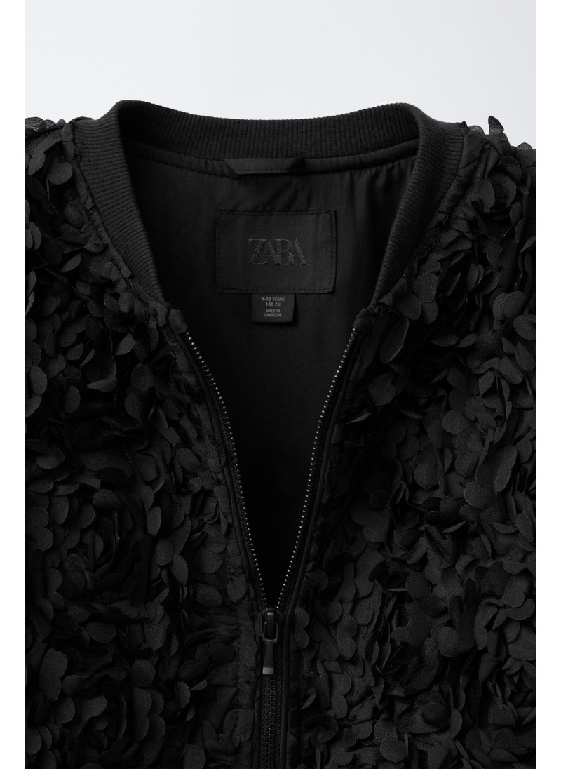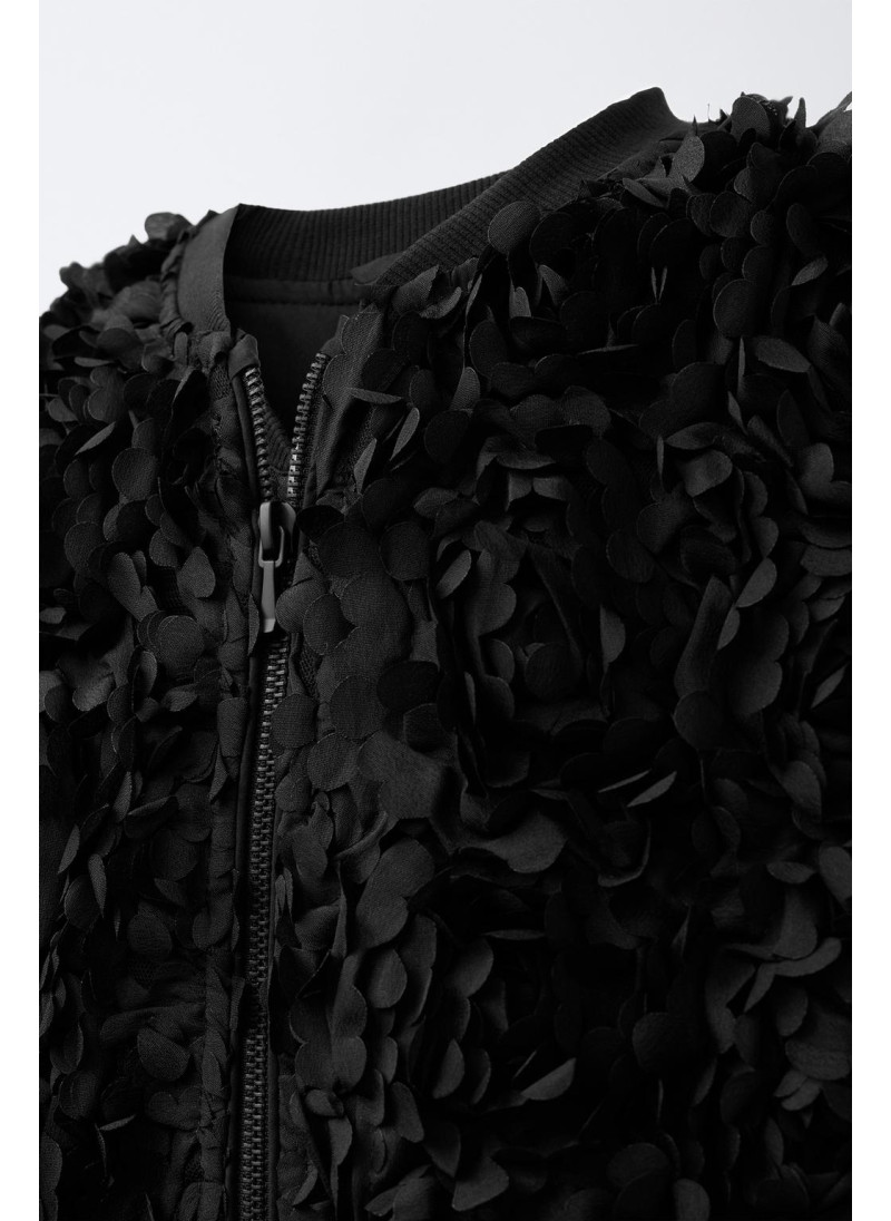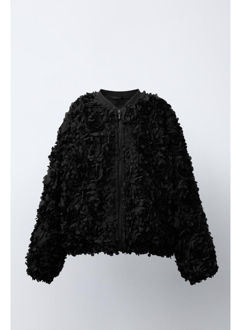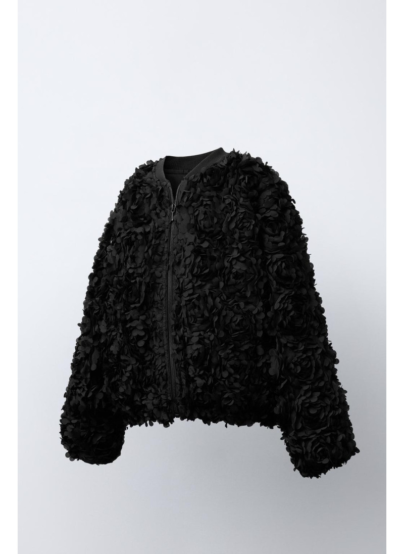 Куртка-бомбер с круглым вырезом и длинными рукавами на резинке. Низ на резинке. Застежка-молния спереди. Цветочная аппликация.