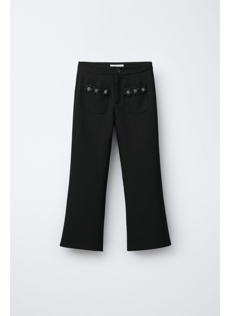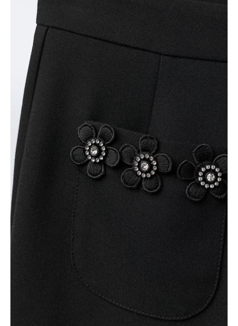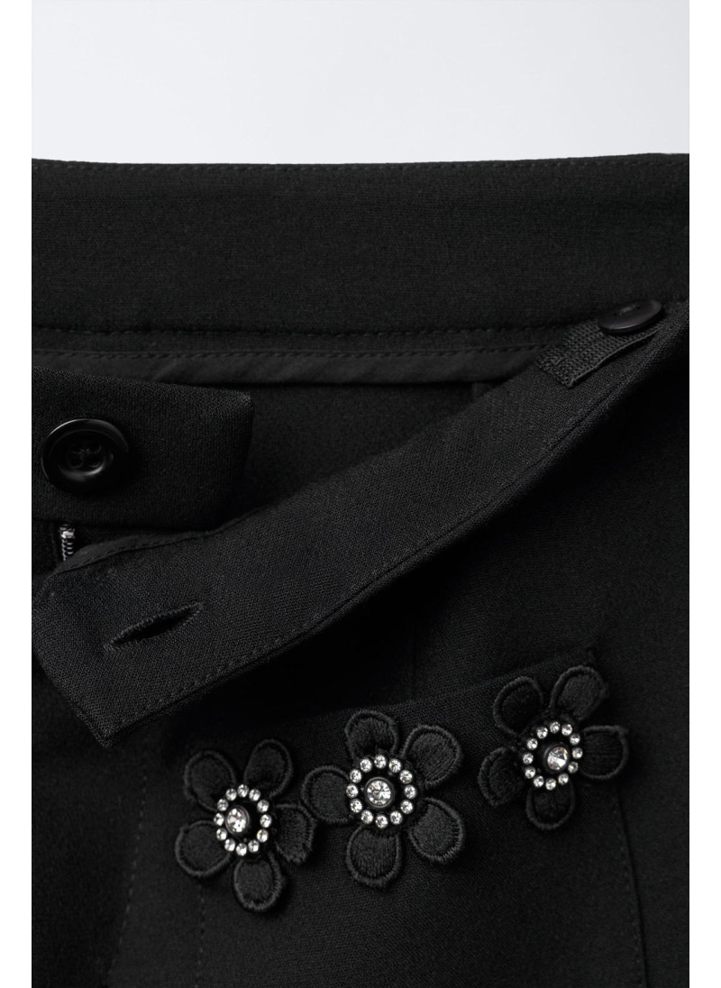 Прямые брюки с регулируемым внутренним поясом и застежкой на пуговицу спереди. Имеют передние накладные карманы с нашивками из цветочных аппликаций и драгоценными деталями.