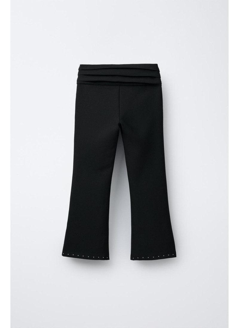 Брюки со шпильками и расширяющиеся штанины с регулируемой внутренней резинкой на талии и скрытой молнией по боковому шву. Имеют складки на талии и аппликации со шпильками на подоле.
