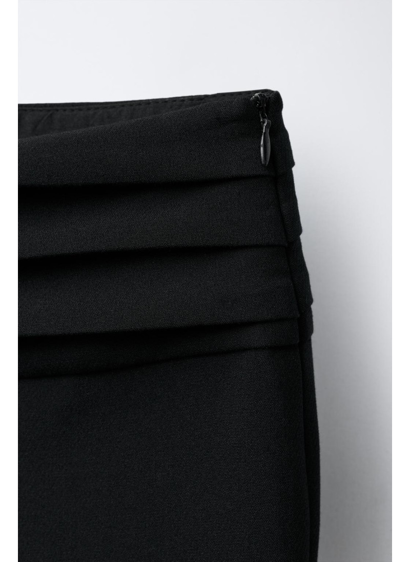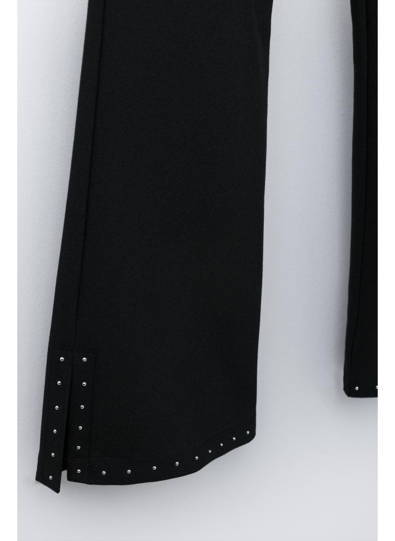 Брюки со шпильками и расширяющиеся штанины с регулируемой внутренней резинкой на талии и скрытой молнией по боковому шву. Имеют складки на талии и аппликации со шпильками на подоле...