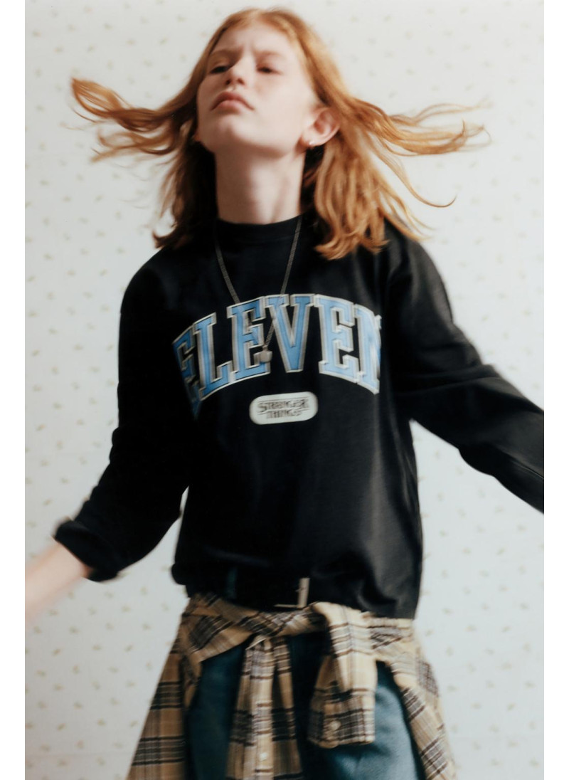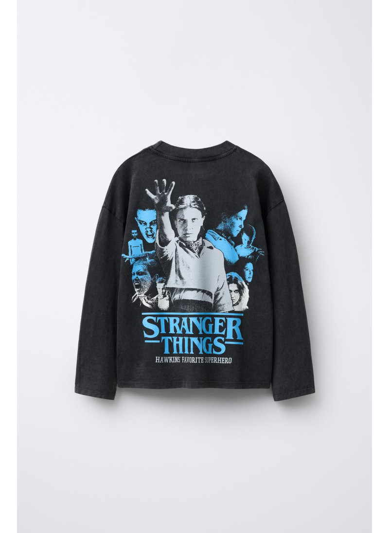Футболка с эффектом потертости, круглым вырезом и длинными рукавами. Принт ELEVEN STRANGER THINGS © NETFLIX спереди и сзади. Ткань 100% хлопок.