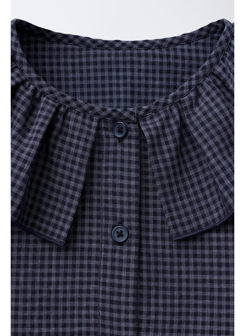 Рубашка с круглым вырезом и воланами, контрастная окантовка. Длинные рукава, манжеты на пуговицах. Застегивается на пуговицы спереди. Принт в клетку виши.