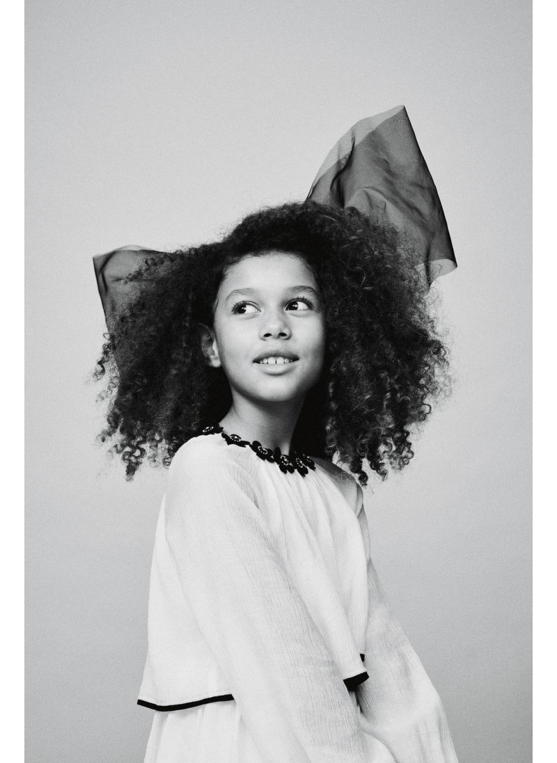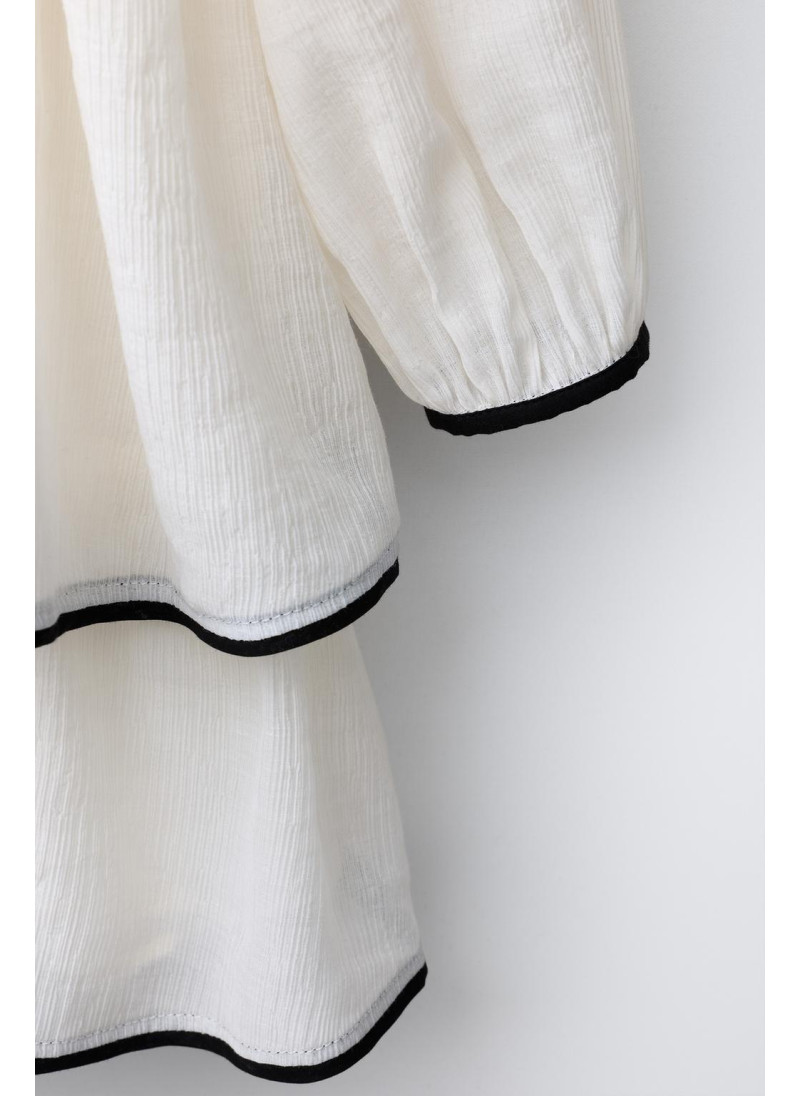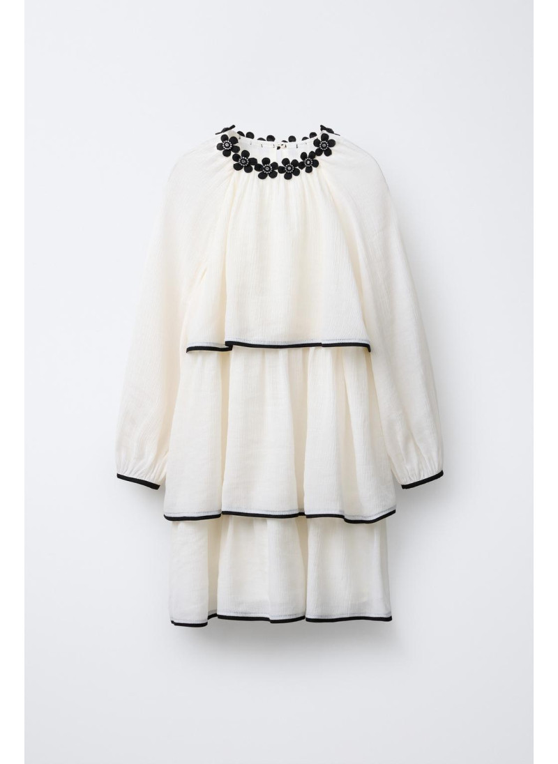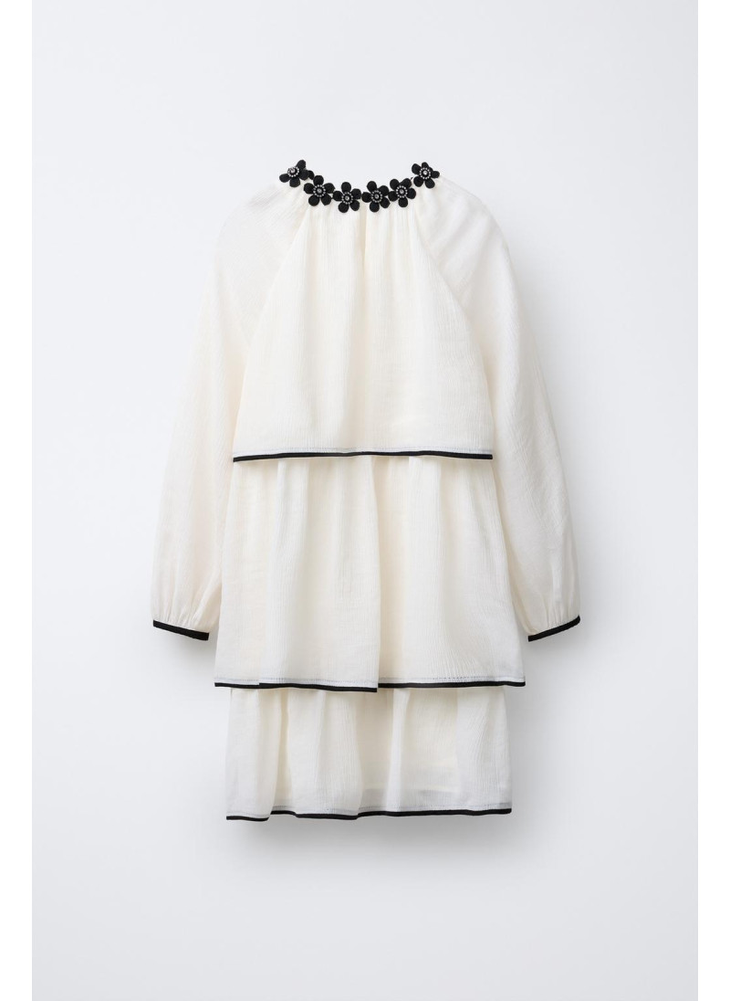 Легкое платье с круглым вырезом и длинными рукавами. Отделка с контрастным кантом. Цветочные аппликации с украшениями на вырезе. Застежка-пуговица в форме капли на спине. Воланы.