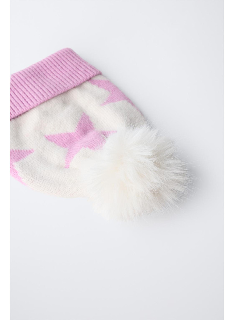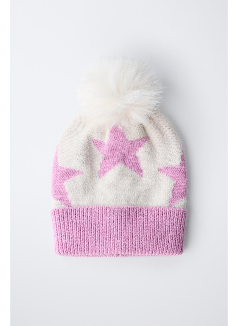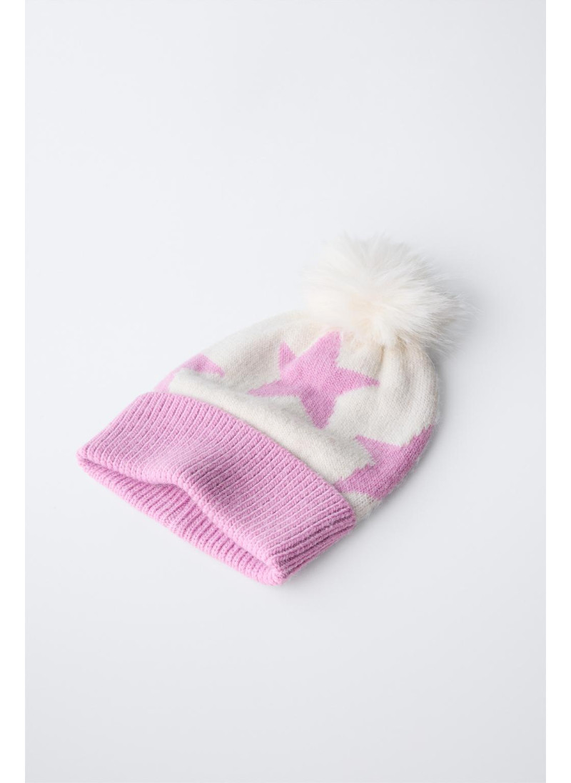 Вязаная шапка с отворотом, украшенная принтом звезды и аппликацией в виде помпона.