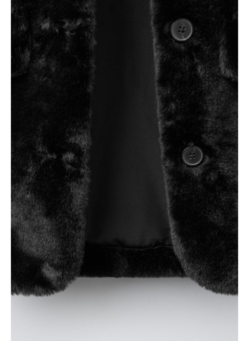 Пальто из искусственного меха с длинными рукавами и воротником с лацканами. Застежка на пуговицы спереди. Передние карманы с клапанами. Подкладка в тон.