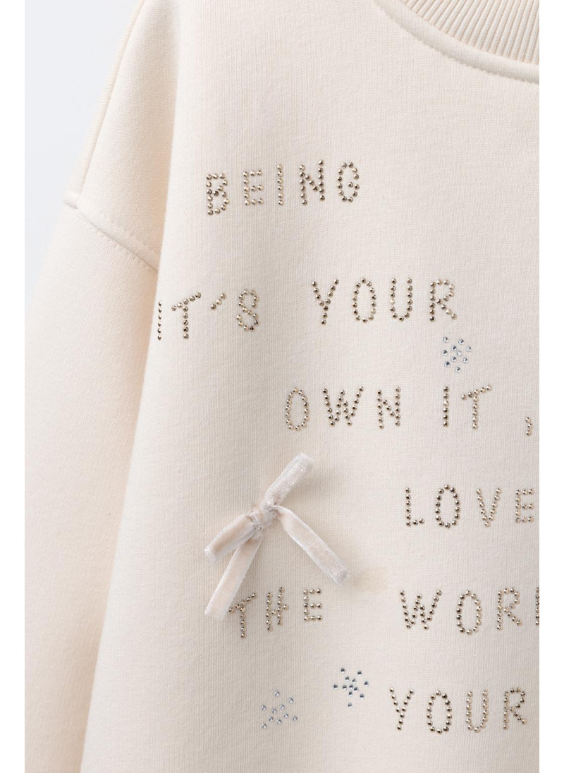 Свитшот с округлым вырезом и длинным рукавом. Украшен аппликацией с кристаллами и бархатными бантами. Мягкая флисовая подкладка для теплого и мягкого ощущения. Ткань на 65% состоит из хлопка.