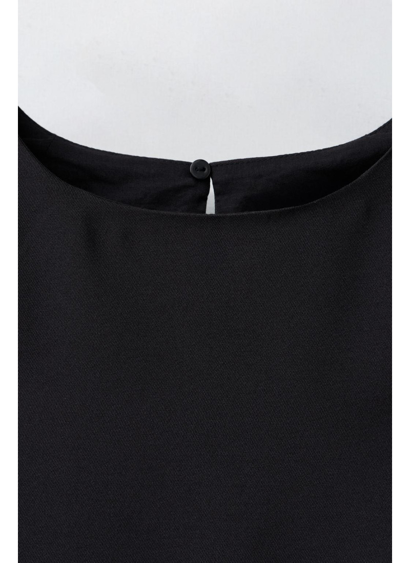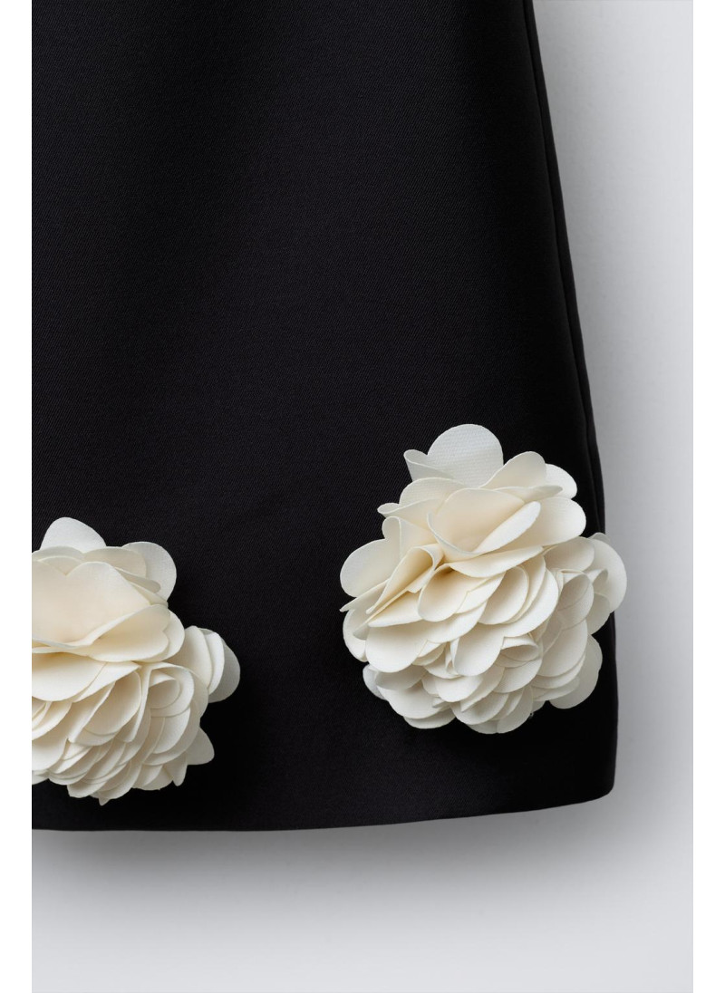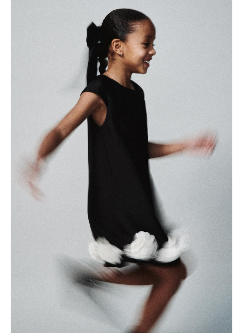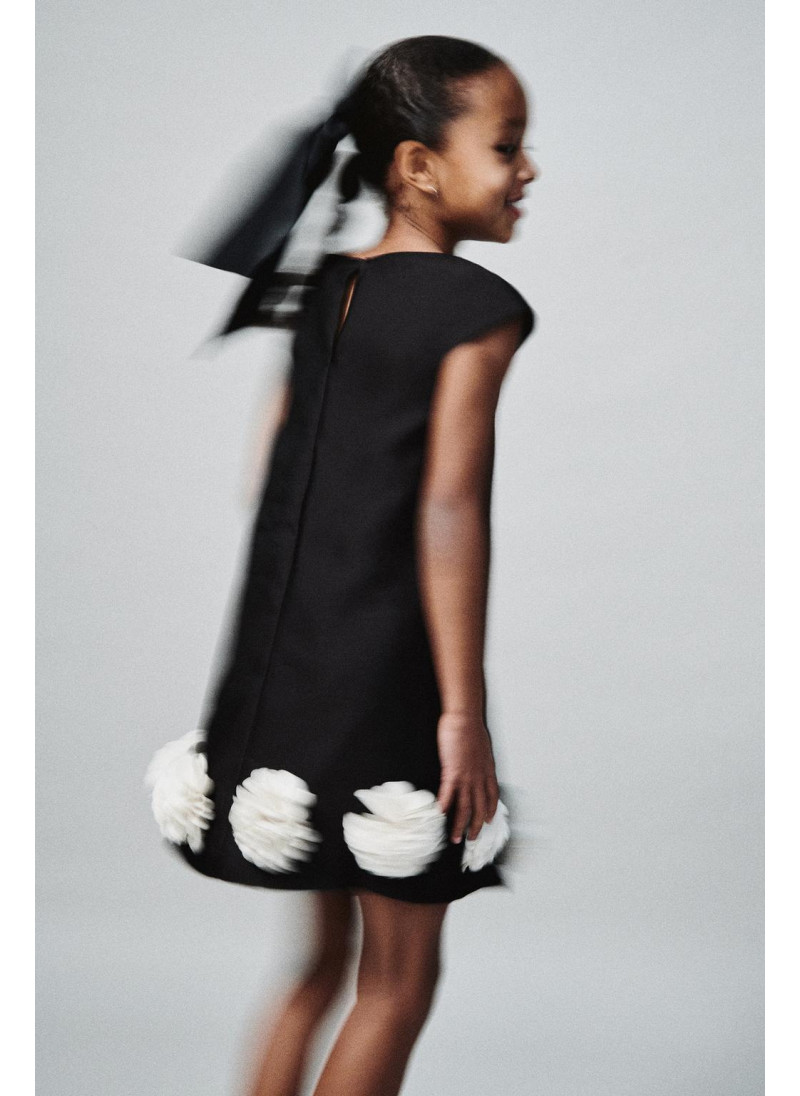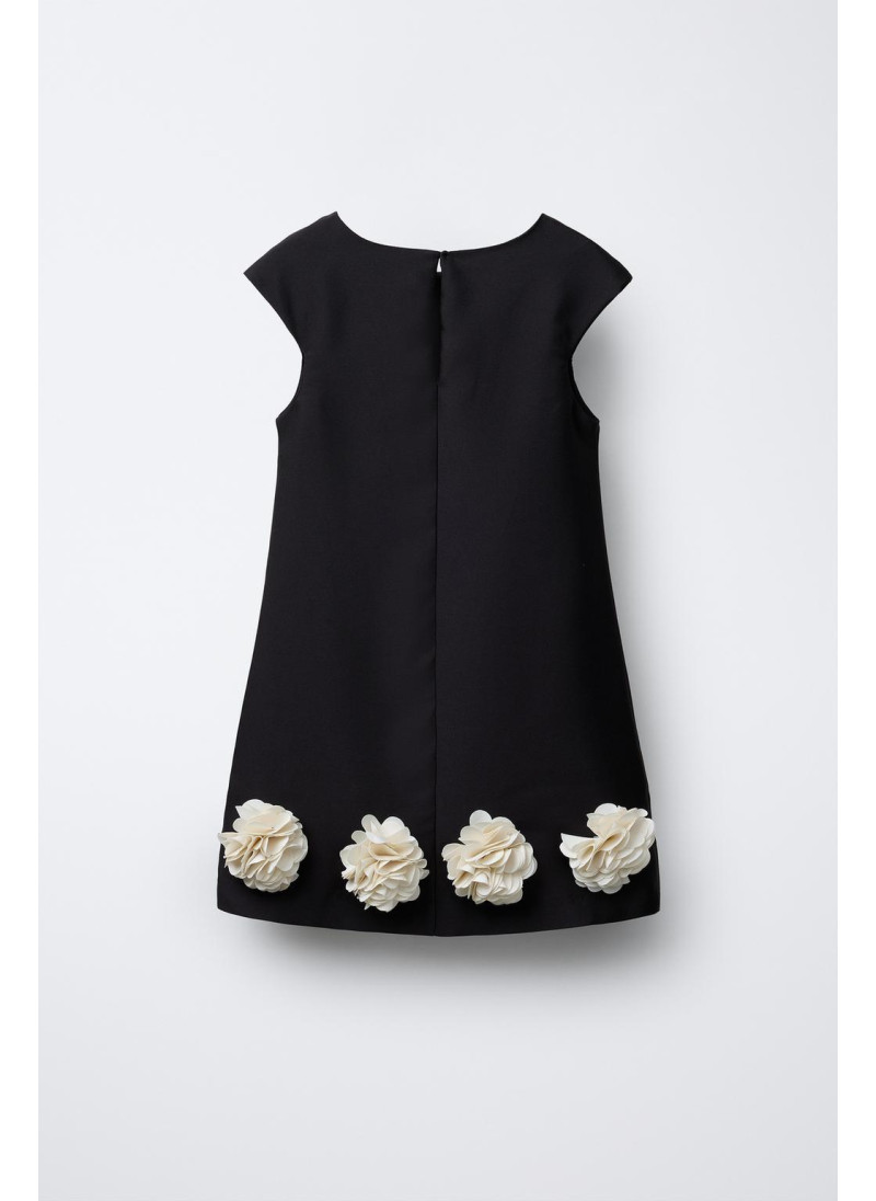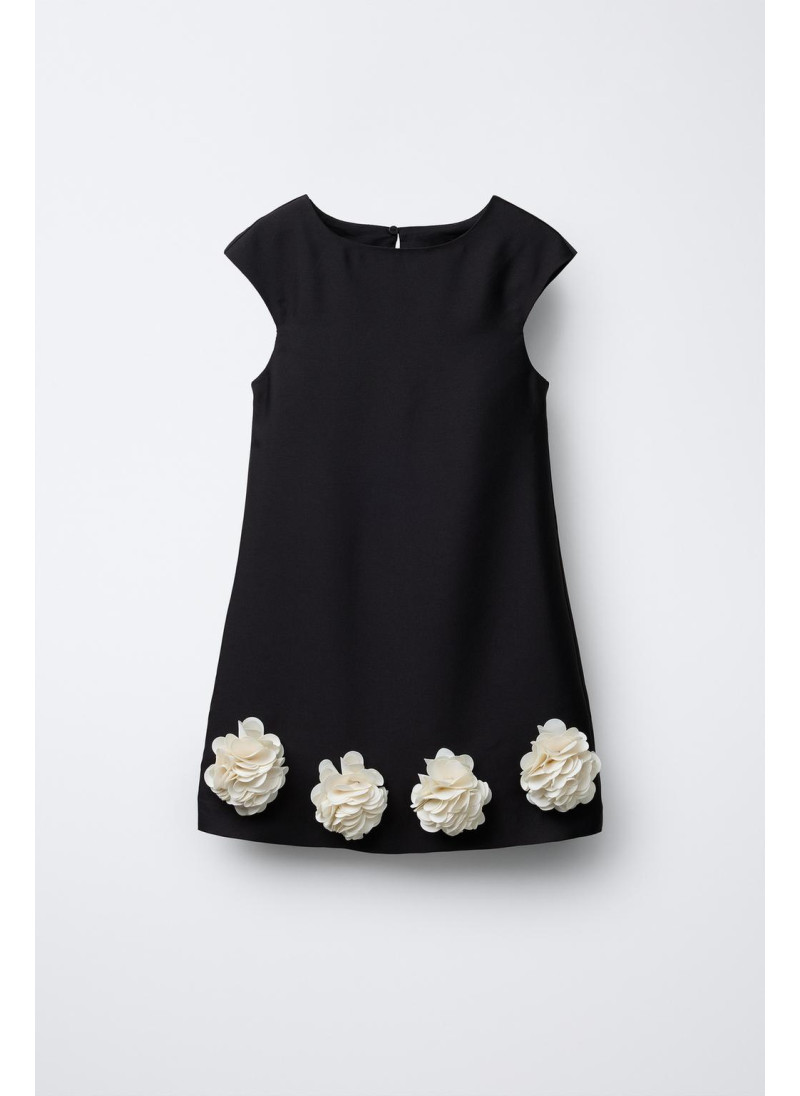 Платье с круглым вырезом и короткими рукавами. Застежка на пуговицу-капельку на спине. Цветочная аппликация по низу.