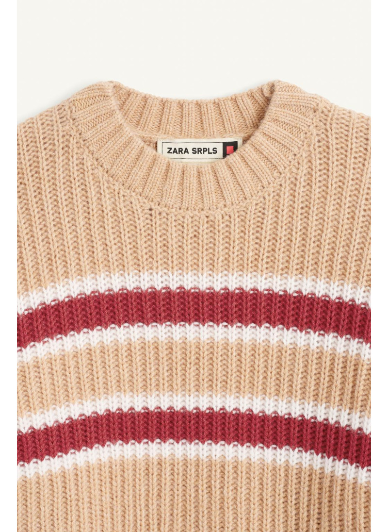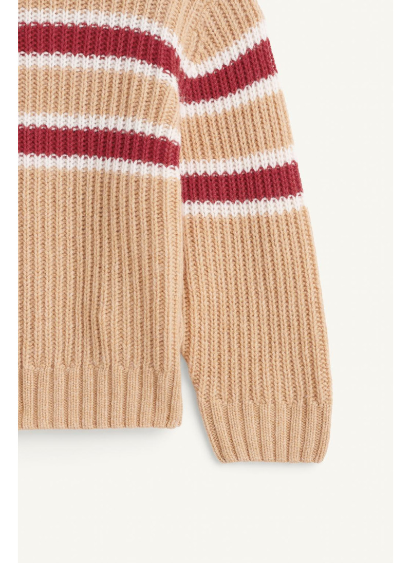 Вязанный джемпер с круглым вырезом и длинными рукавами. Украшен полосатым принтом на груди и рукавах. Изготовлен из 100% шерсти.