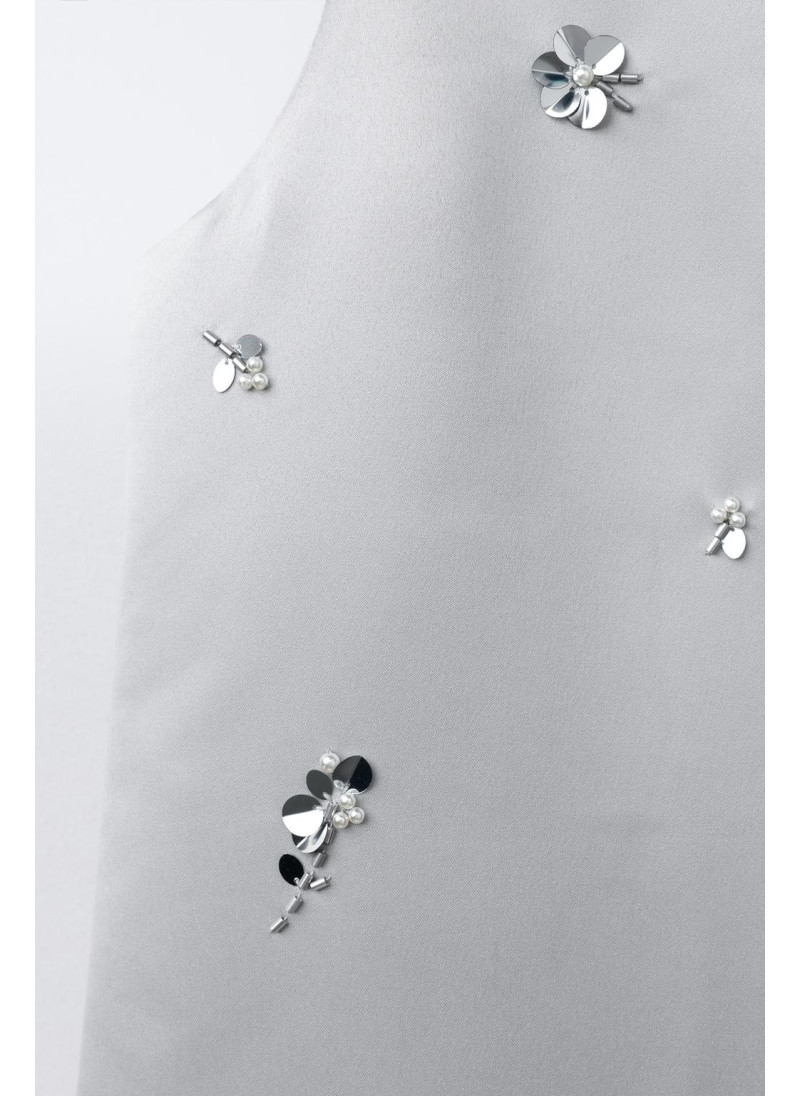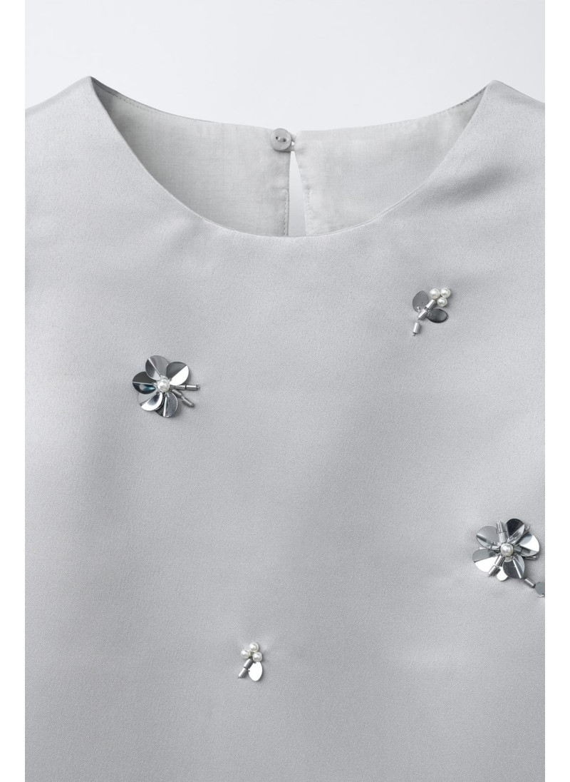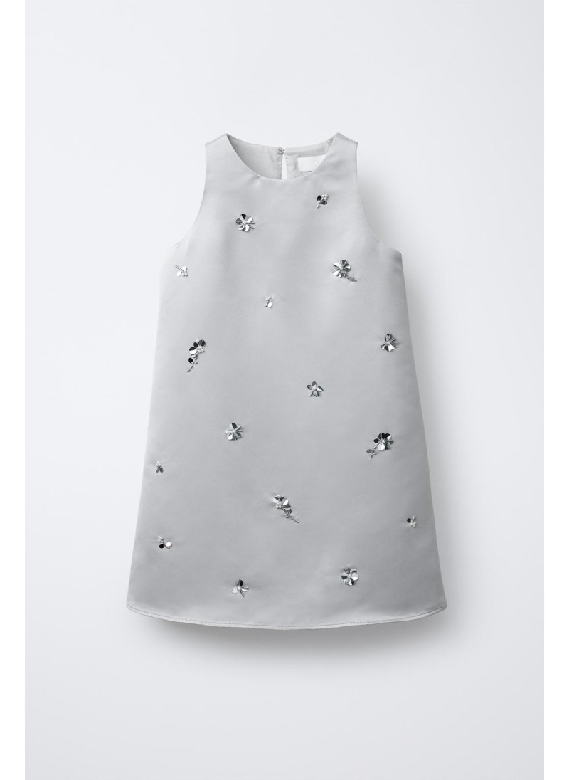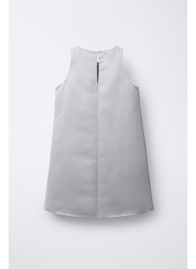 Атласное платье с круглым вырезом и проймой. Застежка на пуговицу-каплю сзади. Пайетки спереди.