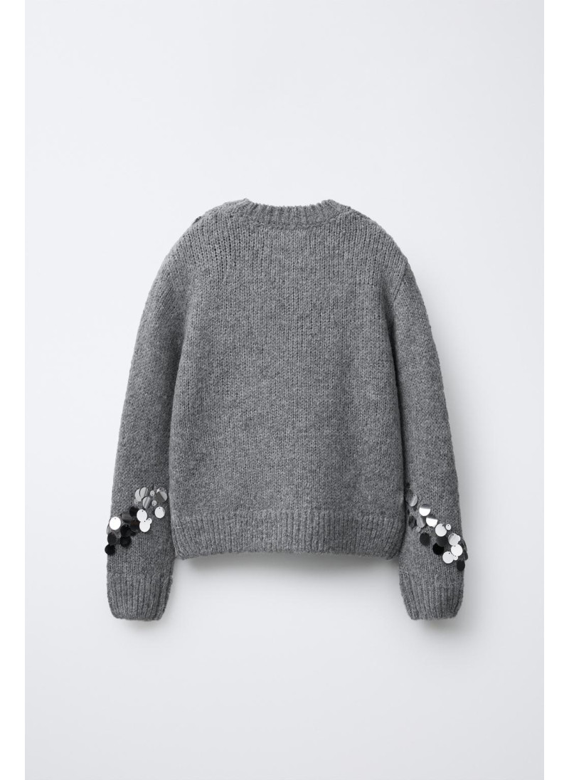Трикотажный свитер с круглым вырезом и длинными рукавами. Пайетки на передней части и рукавах.